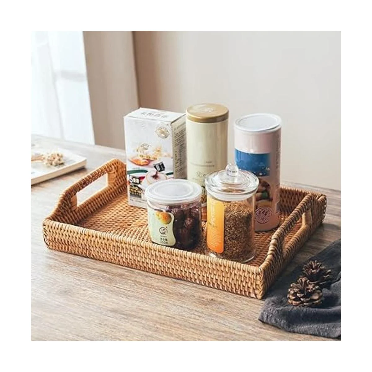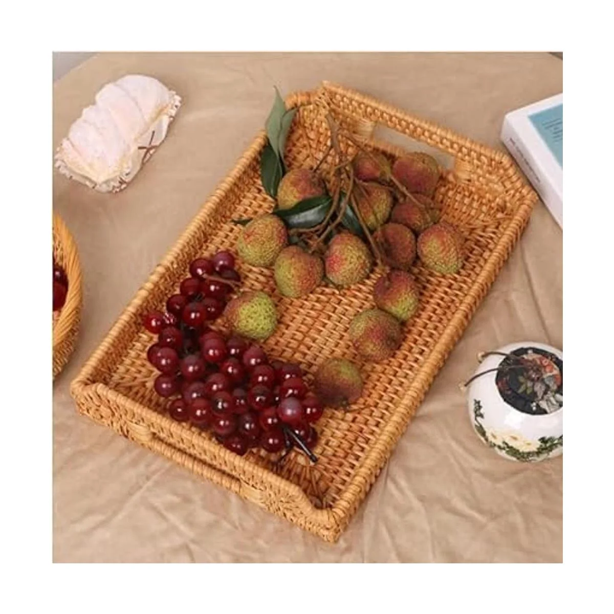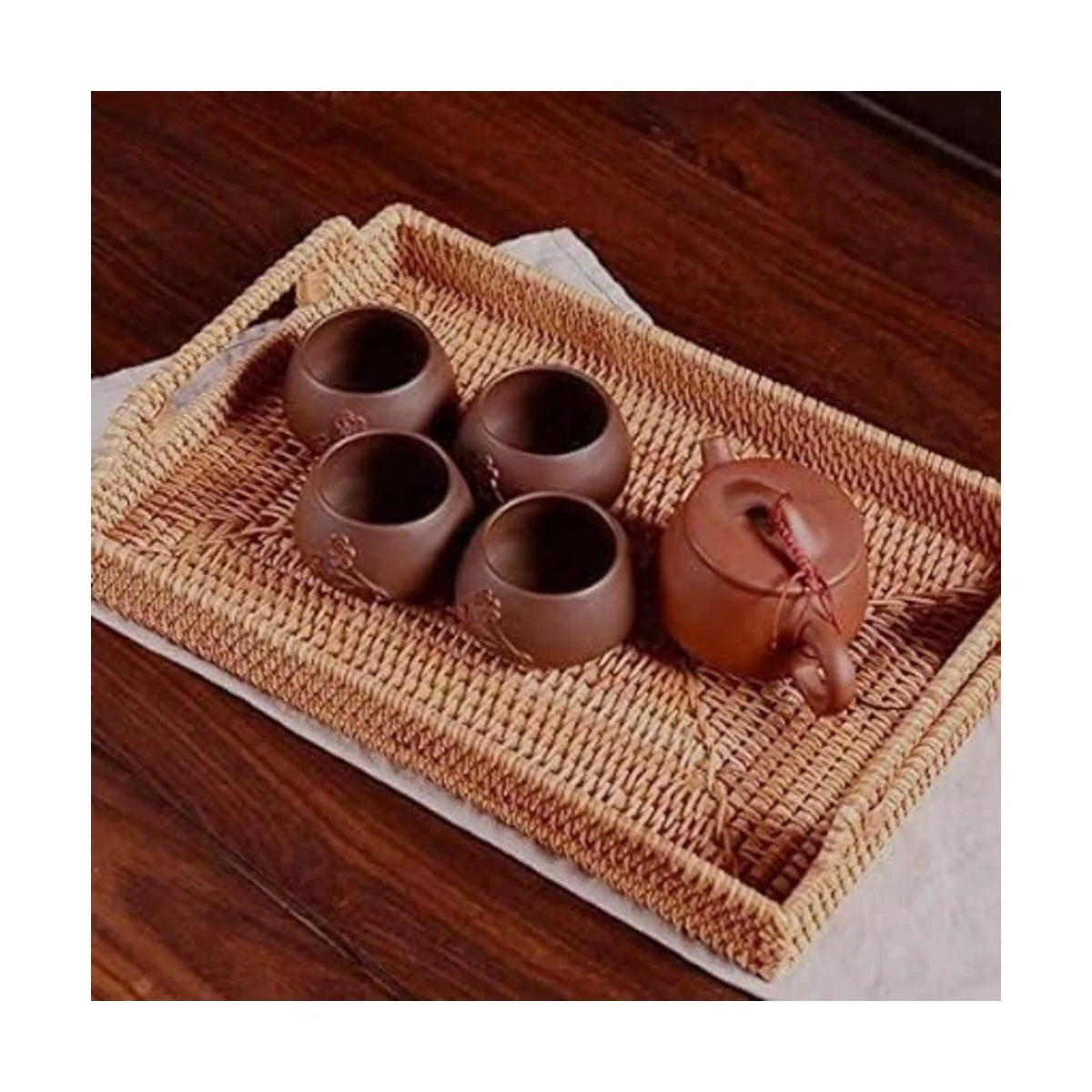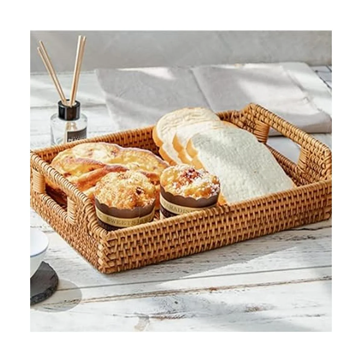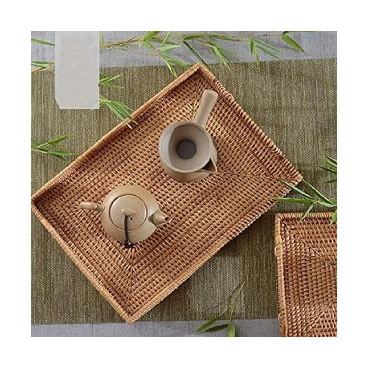 Bandeja de ratán tejida a mano con asas para desayuno, bebidas, aperitivos para comedormesa auxiliar 17 pulgadas 16.9 in, rectangular
