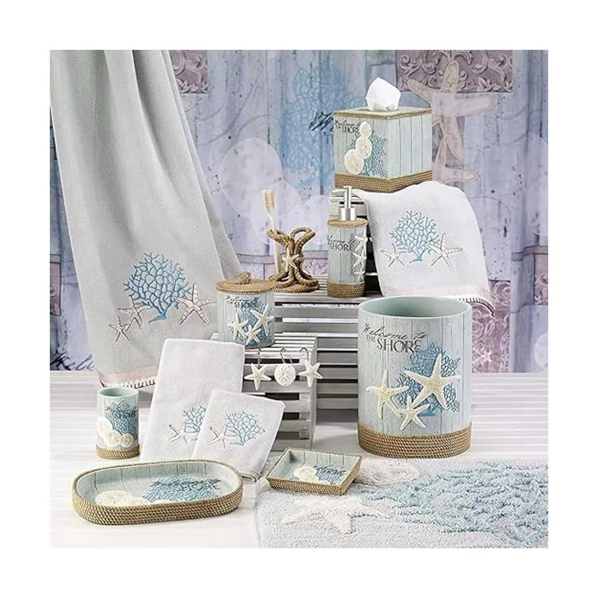 La colección Avanti Home Beachcomber cuenta con estrellas marinas, dólares de arena, coral abanico, detalles de trenza de cuerda y colores aguamarina y marfil.