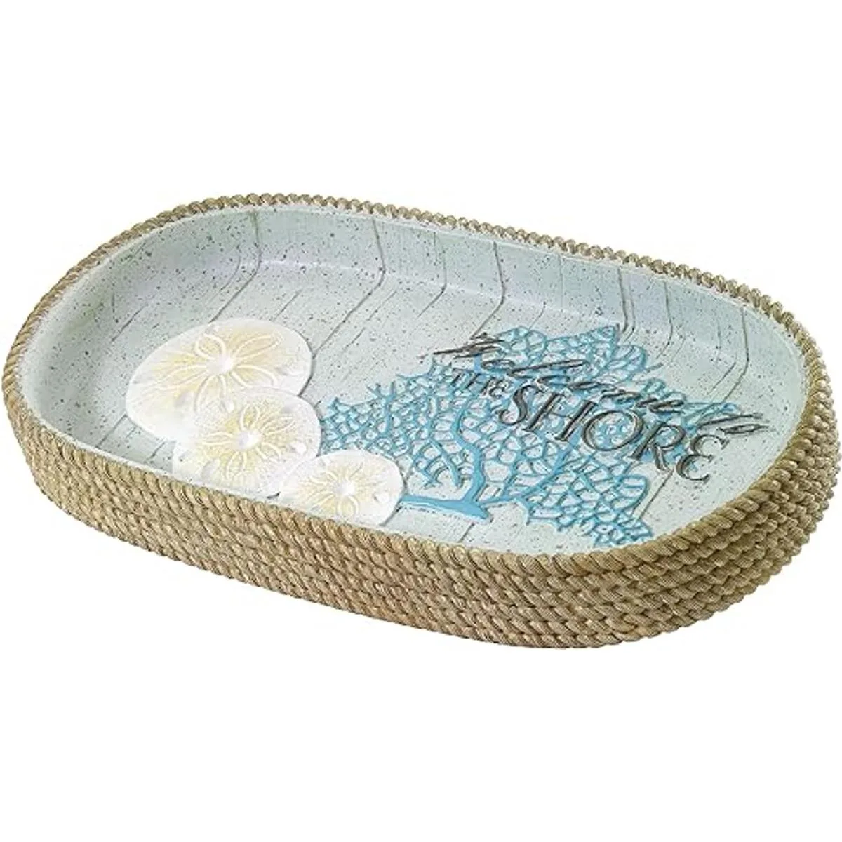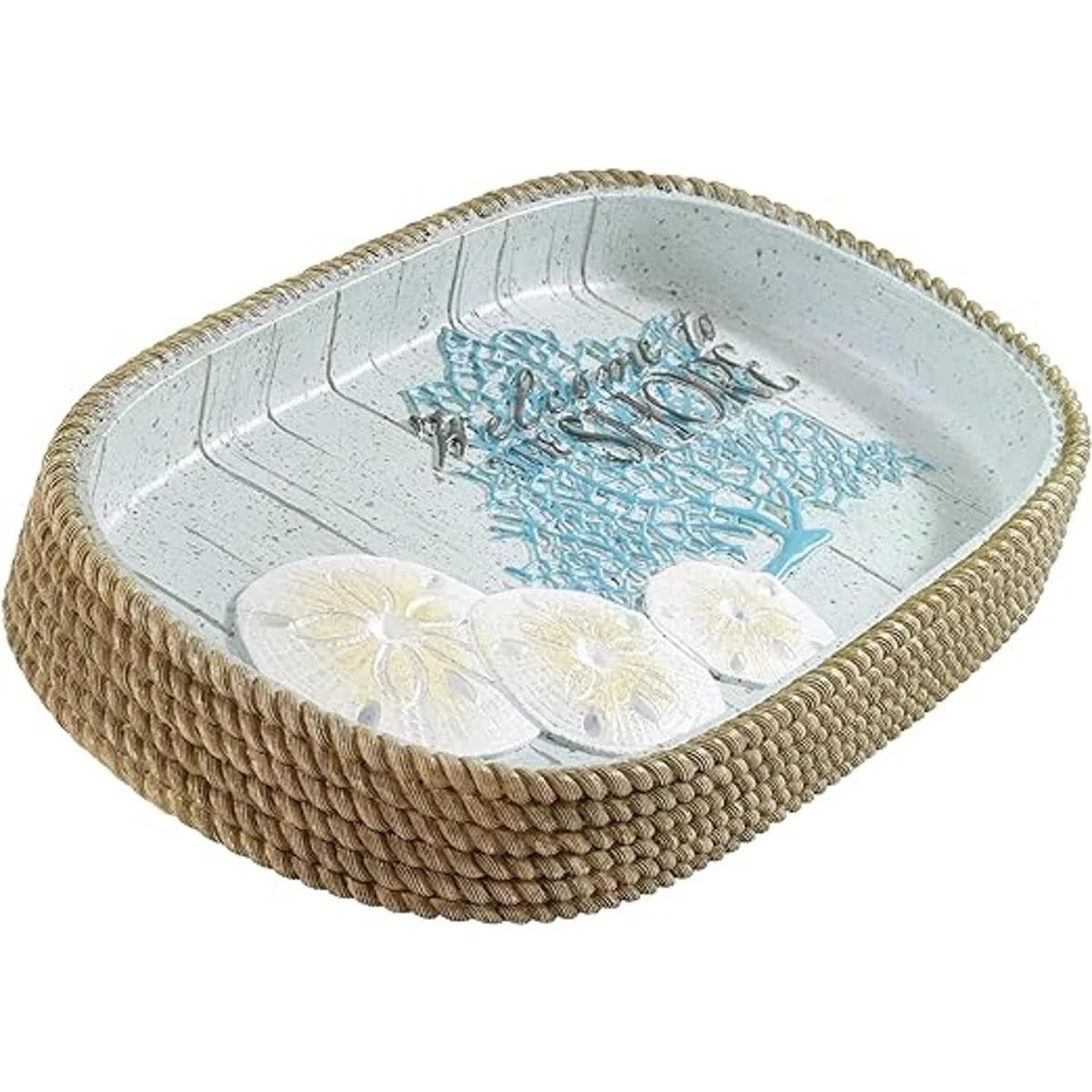La bandeja Beachcomber cuenta con coral abanico, dólares de arena y las palabras Welcome to the shore sobre un fondo aqua shiplap.
