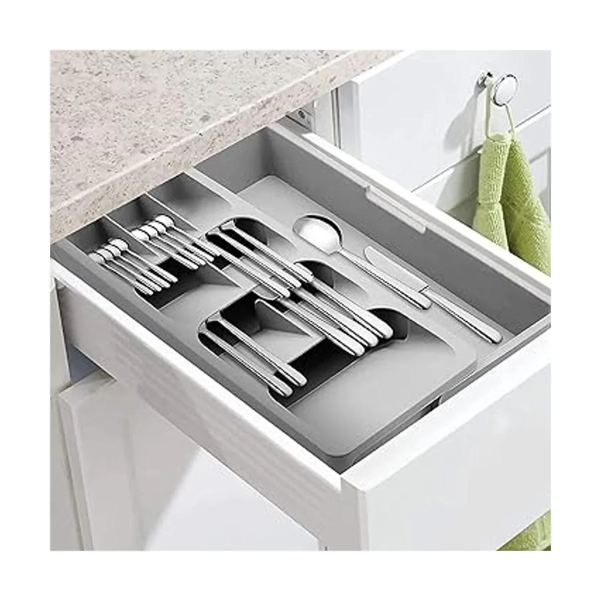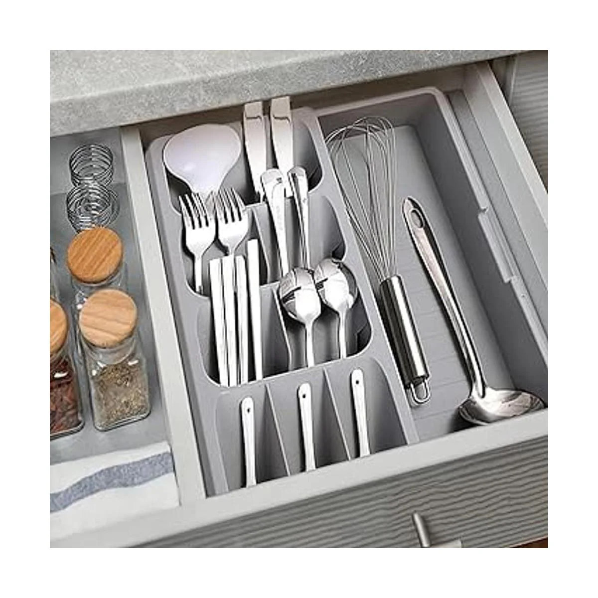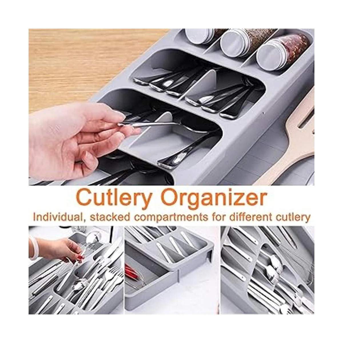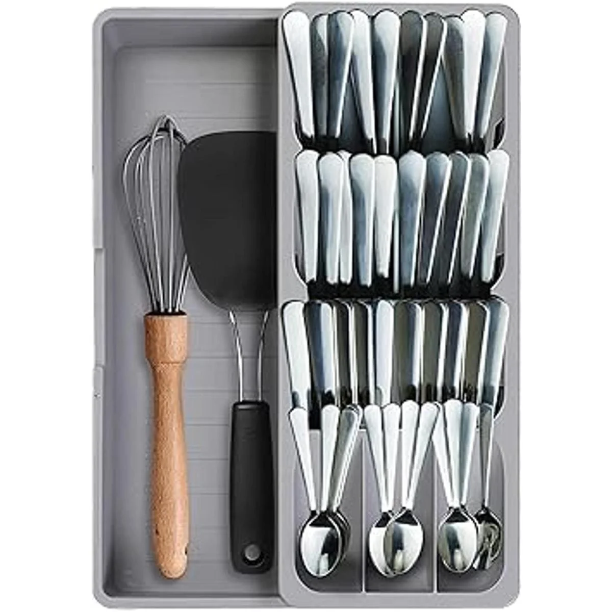 Caja de almacenamiento para cubiertos de cajón de cocina hecha de plástico seguro y duradero.