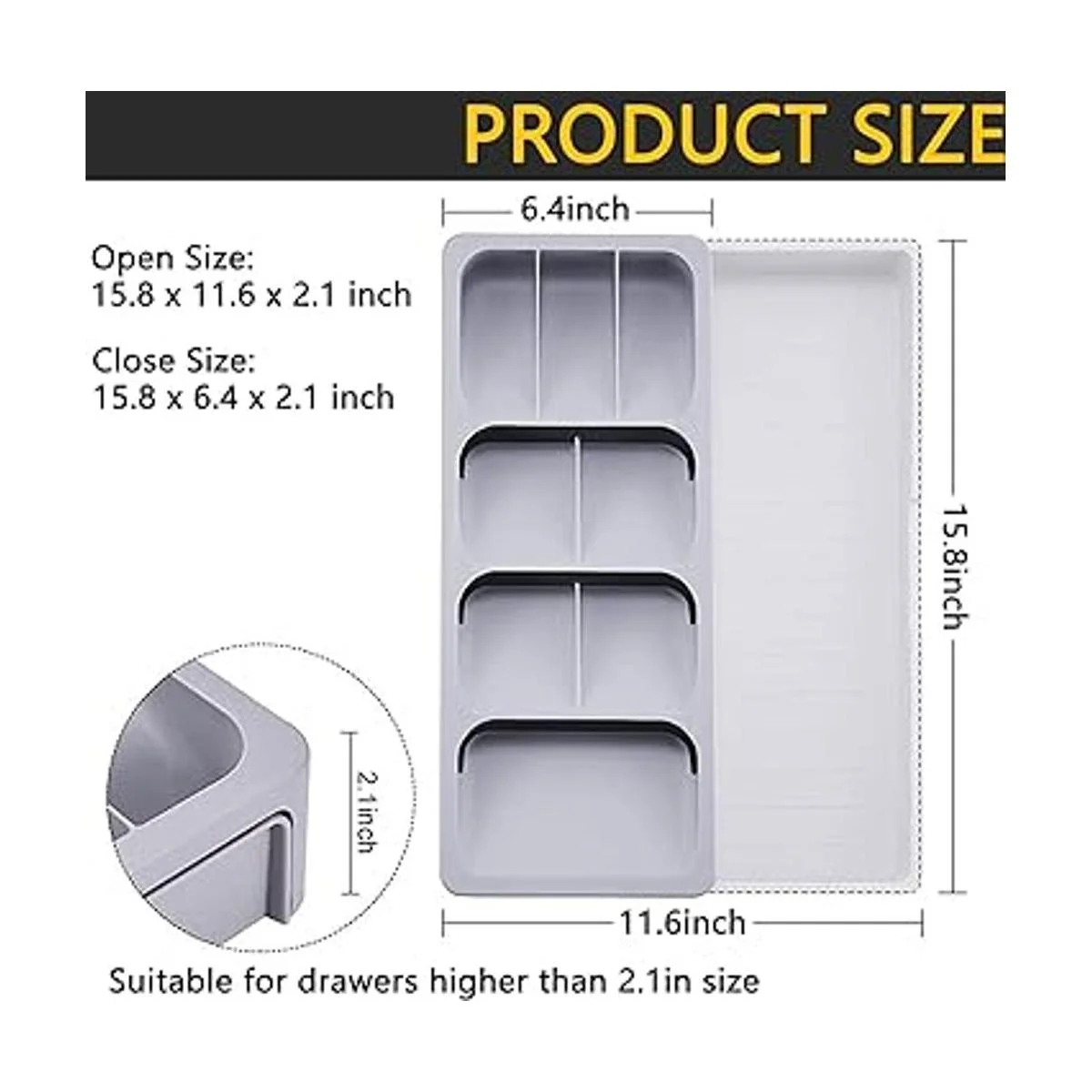 Dimensiones: 15.8 x 6.5 x 2.2 pulgadas. Asegúrate de medir tus cajones antes de comprar. Asegúrate de que el organizador de cubiertos cabe en tu cajón. Si tienes alguna pregunta o problema, no dudes en ponerte en contacto con nosotros. Te proporcionaremos un servicio al cliente 100 de satisfacción para ti.