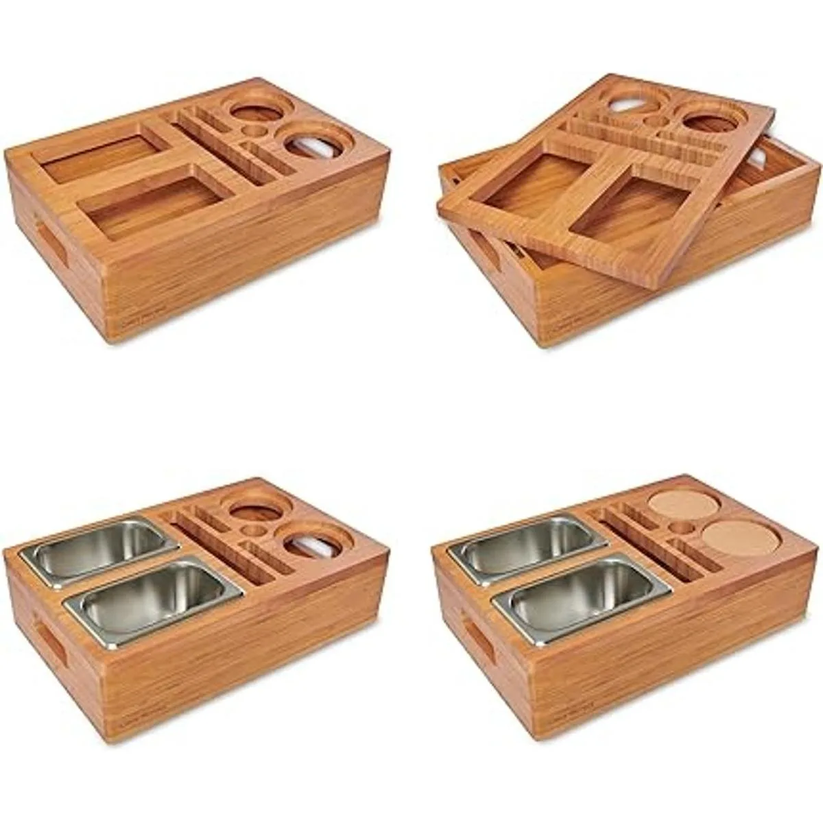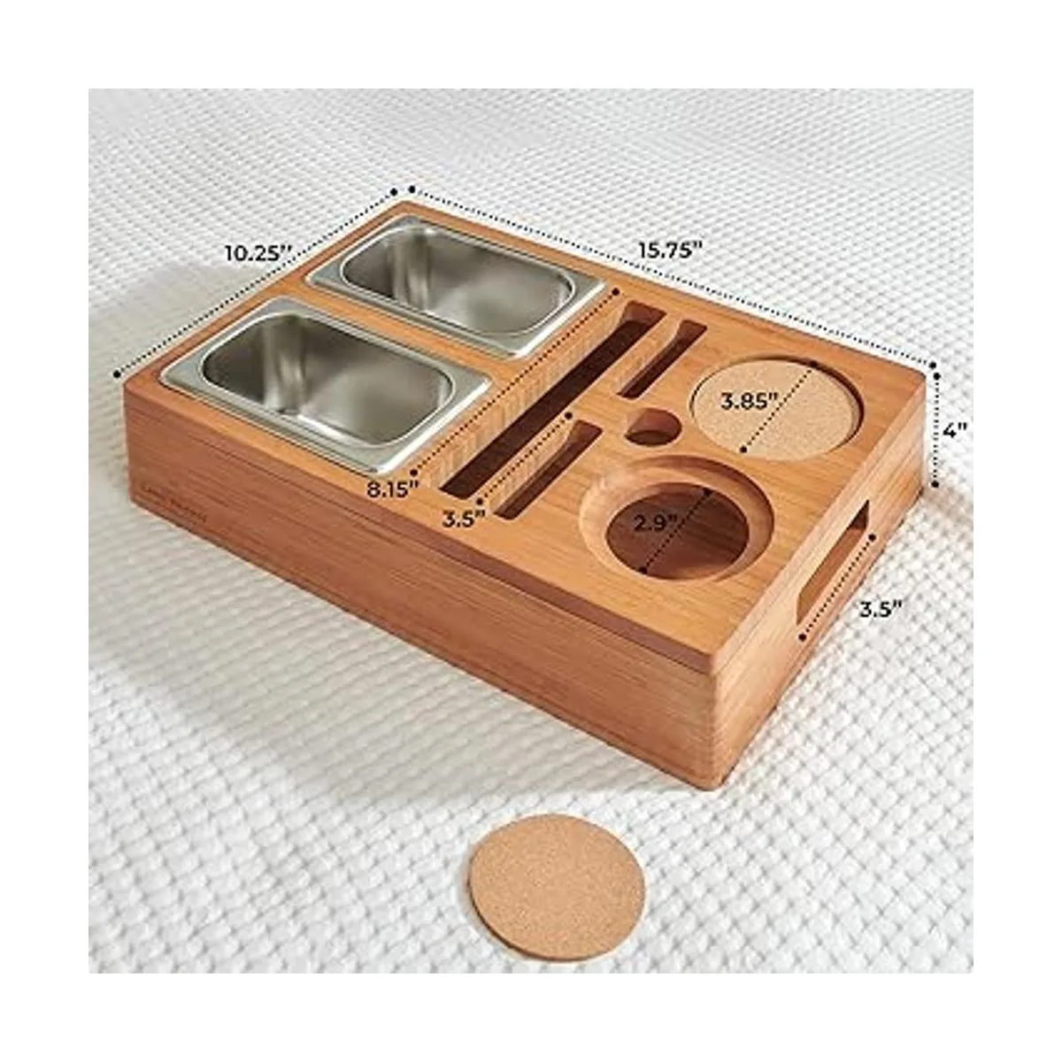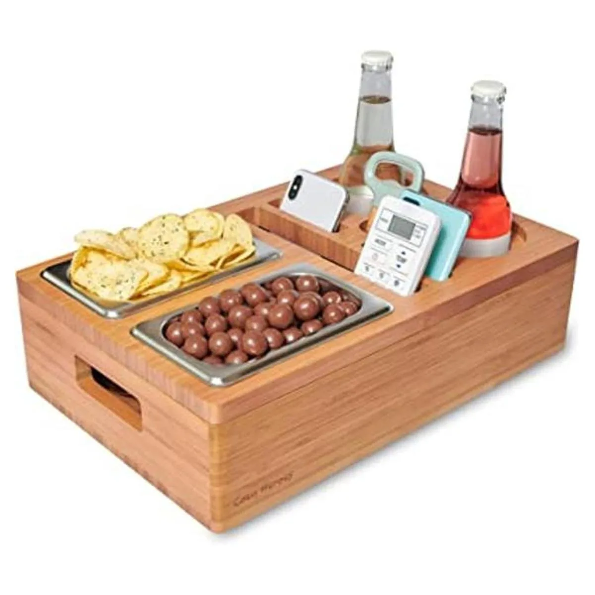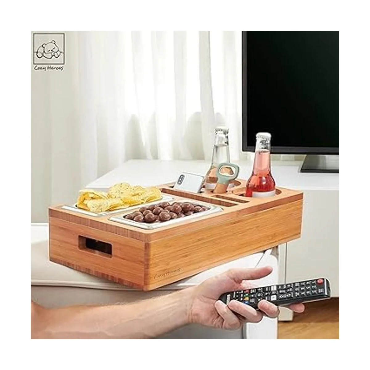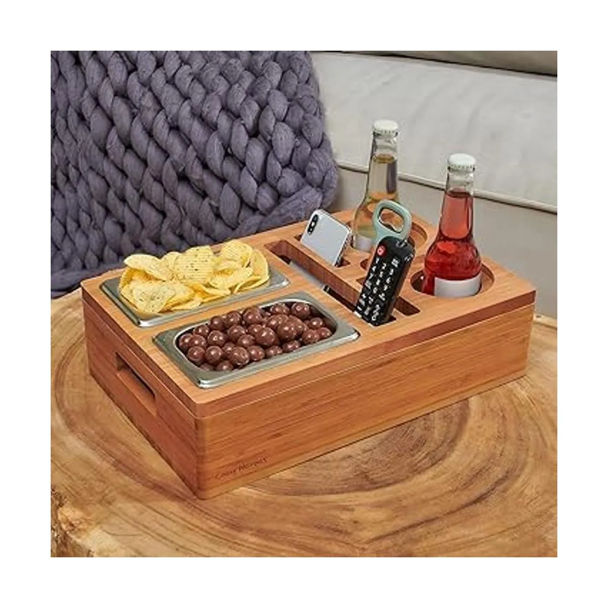Bandeja para portavasos para sofá, diseño de tapa extraíble, práctico soporte para bebidas para sofá, cama y más, organizador de aperitivos de madera de bambú con control remoto y soporte para teléfono