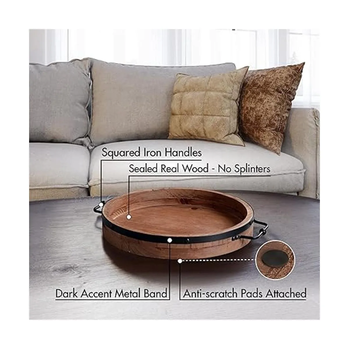 Madera real que dura: hecha de madera real, no MDF barato, esta bandeja redonda de madera está diseñada para durar. La madera es lisa sin astillas para estar segura en la parte superior otomana. Con 4 almohadillas antiarañazos en la parte inferior, no raya ningún mueble. Acentúa tu mesa de café con esta bandeja redonda de madera ahora