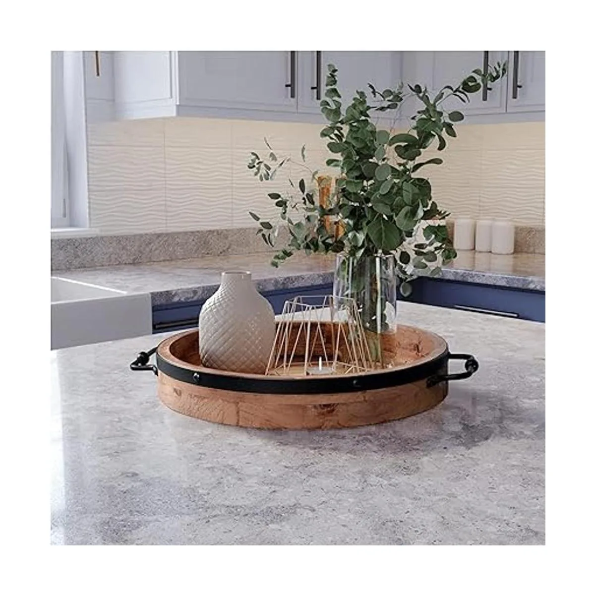 Abalorio único de granja: esta bandeja redonda hecha de madera real con una banda de metal oscuro mezcla un acento rústico en la parte superior del barril de vino. Con asas de metal cuadradas y un cálido color de madera natural, es la bandeja de exhibición perfecta para añadir un encanto de granja a tu espacio vital.