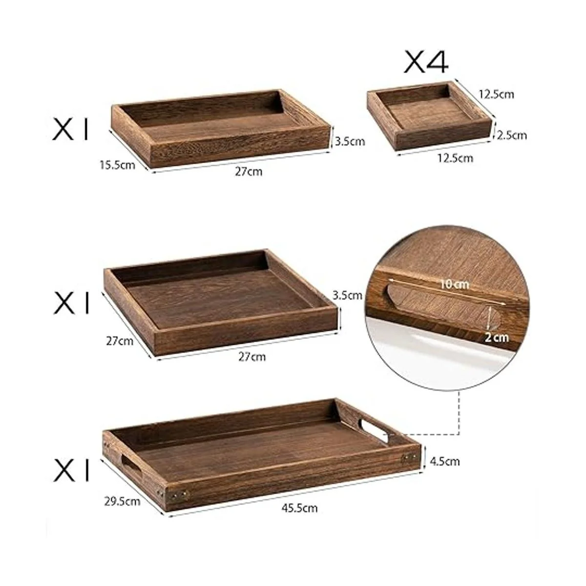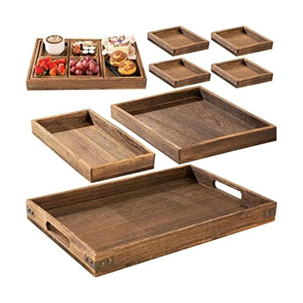 Bandejas de madera rústica con asa, juego de 7, grandes, medianas, pequeñas y mini, bandejas multiusos anidadas, para desayuno, mesa de centro, mayordomo y más, madera de paulownia ligera y resistente