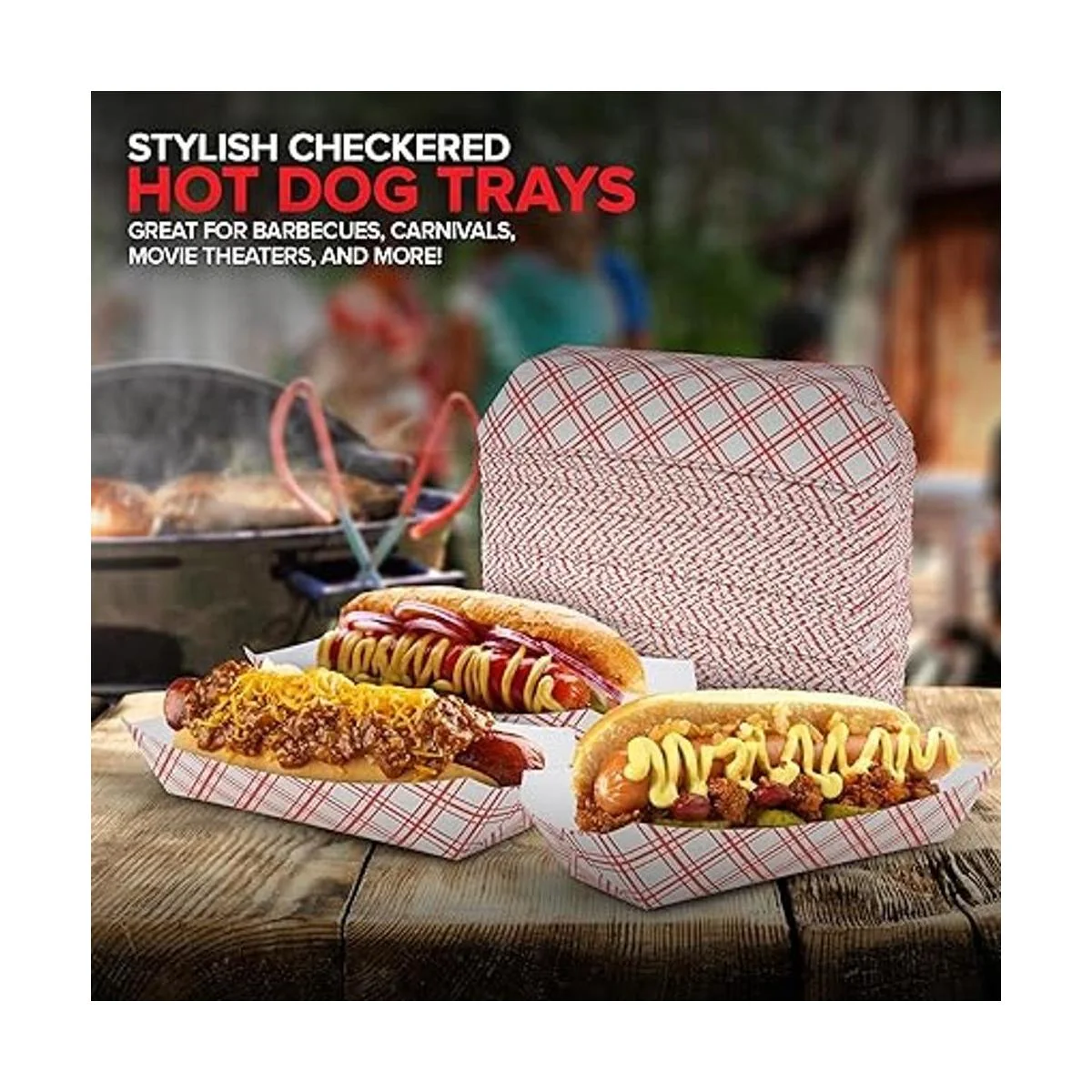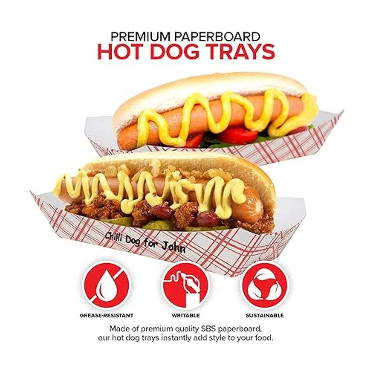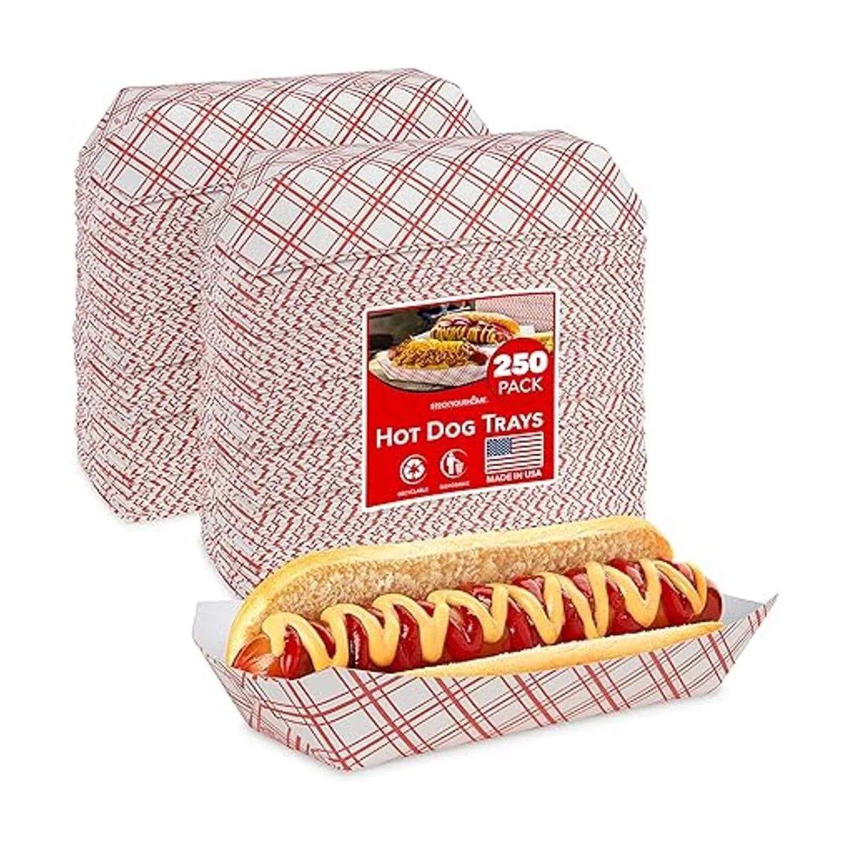Fabricado con orgullo en los Estados Unidos: nuestras bandejas de perro caliente rojo y blanco a cuadros añaden estilo a tu comida. Hechas de cartón SBS de alta calidad, nuestras bandejas para perros calientes son resistentes a la grasa, se pueden escribir y desechar. Con un diseño vintage a cuadros, nuestras bandejas para perritos calientes despiertan diversión y emoción al instante para personas de todas las edades. Utilízalos para servir perritos calientes, perros de chile cargados, perros vegetales, perros de maíz, salchichas, bratwurst y mucho más