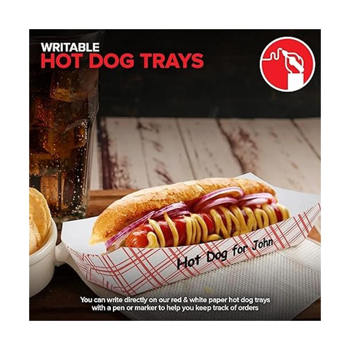 Bandejas para escribir: puedes escribir directamente en nuestras bandejas de papel rojo y blanco con un bolígrafo o marcador para ayudarte a realizar un seguimiento de los pedidos. También puedes personalizar fácilmente nuestras bandejas para perros calientes añadiendo el logotipo de tu empresa, icono y/o pegatina. Perfecto para soportes de perros calientes, camiones de comida, restaurantes de comida rápida, estadios, puestos de concesión, carnavales, barbacoas, picnics, y mucho más
