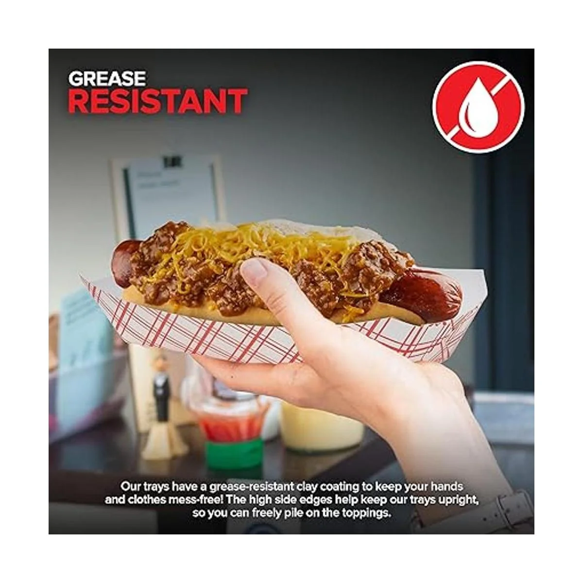 Resistente a la grasa: no hay necesidad de preocuparse por fugas y derrames. Hemos recubierto nuestras bandejas para perros calientes a cuadros en un revestimiento de arcilla resistente a la grasa para mantener tus manos y ropa sin ensuciar. Los bordes laterales altos ayudan a mantener nuestras bandejas y su contenido en posición vertical, por lo que puedes apilar libremente en los ingredientes. Cuando hayas terminado de usarlos, simplemente tira nuestras bolsas desechables para perros calientes en la basura.