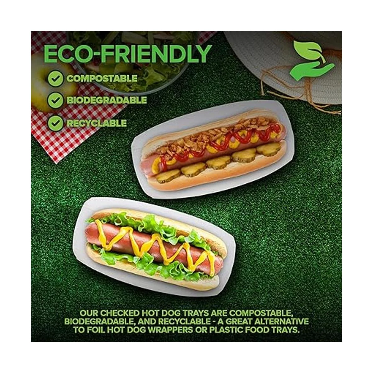Ecológico: nuestras bandejas de perro caliente a cuadros son compostables, biodegradables y reciclables, lo que las hace una gran alternativa a los envoltorios de papel de aluminio para perros calientes o bandejas de alimentos de plástico. Mediante el uso de nuestras bandejas para perros calientes estás ayudando a mantener el papel de aluminio, plástico y otros materiales nocivos fuera de los vertederos, beneficiando general el medio ambiente.