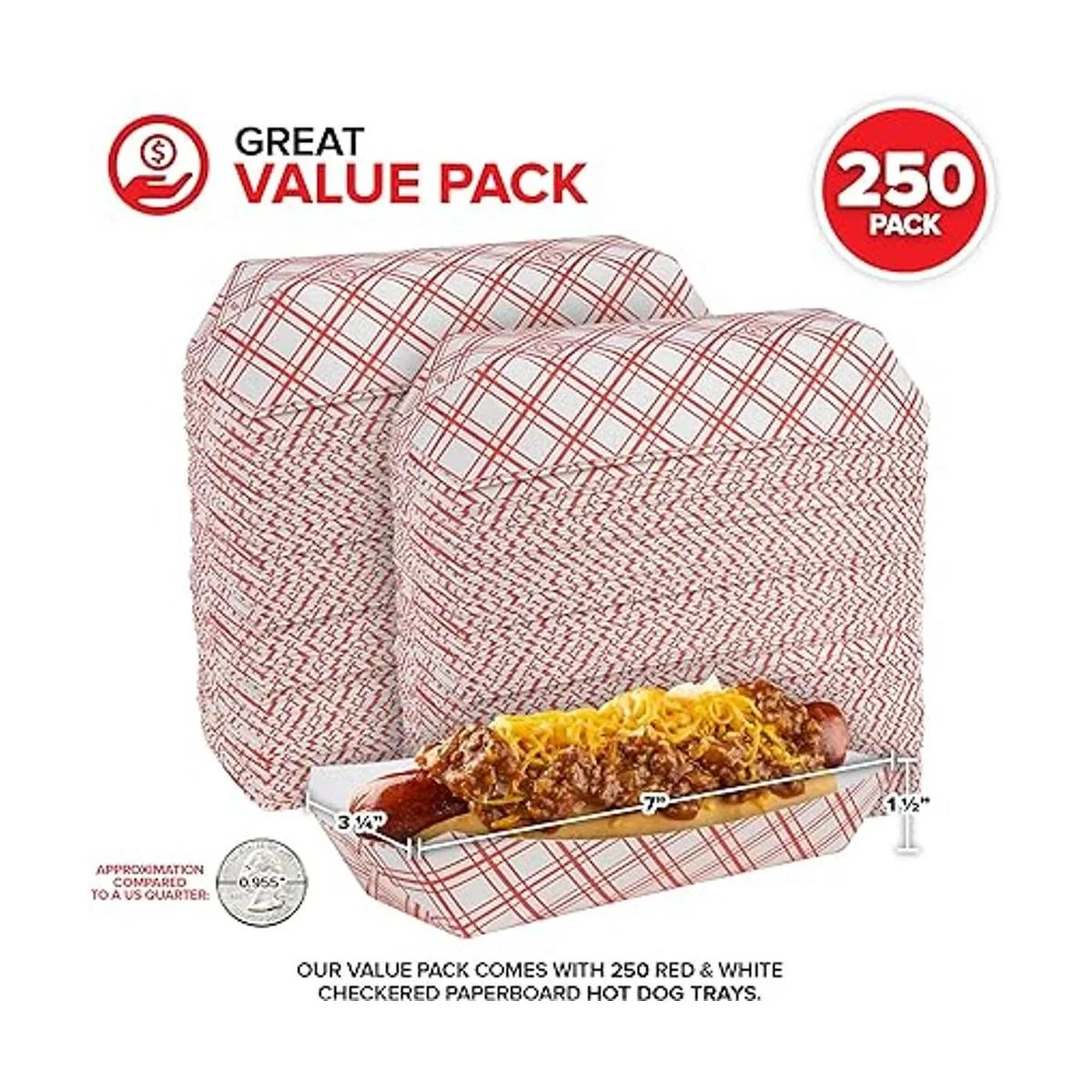 Paquete de gran valor: nuestro paquete viene con 250 bandejas de cartón rojo y blanco. Las bandejas miden aproximadamente 7.0 in de largo x 3.4 in de ancho x 1.5 in de alto. Si compostas en casa, corta y/o tritura bien las bandejas y utiliza medidas de compostaje adecuadas.