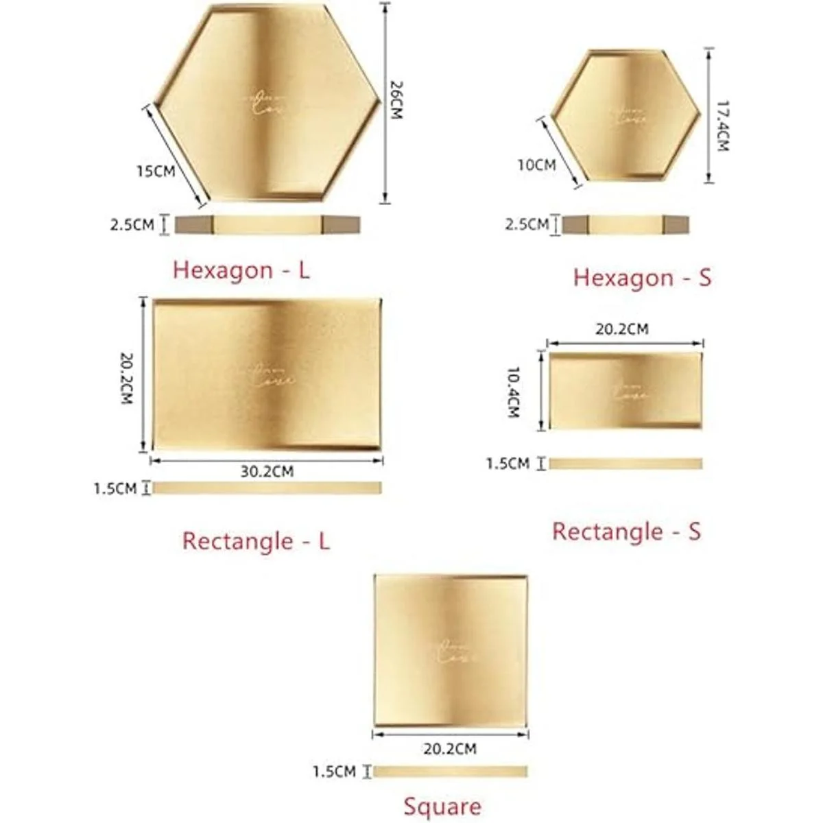 Bandejas de acero inoxidable doradas, bandeja de almacenamiento de metal: la bandeja organizadora de almacenamiento de metal está hecha de acero inoxidable de alta calidad con un acabado suave, duradero. Fácil de limpiar, simplemente limpiar con un paño. Disponible en 5 tipos para satisfacer tus diversas necesidades de decoración: bandeja rectangular pequeña de aproximadamente 8.0 x 4.1 x 0.6 in, bandeja rectangular grande de aproximadamente 11.9 x 8.0 x 0.6 in, bandeja hexagonal pequeña de 6.9 x 3.9 x 1.0 in, bandeja hexagonal grande de aproximadamente 8.0 x 5.9 in. 2.0 in.