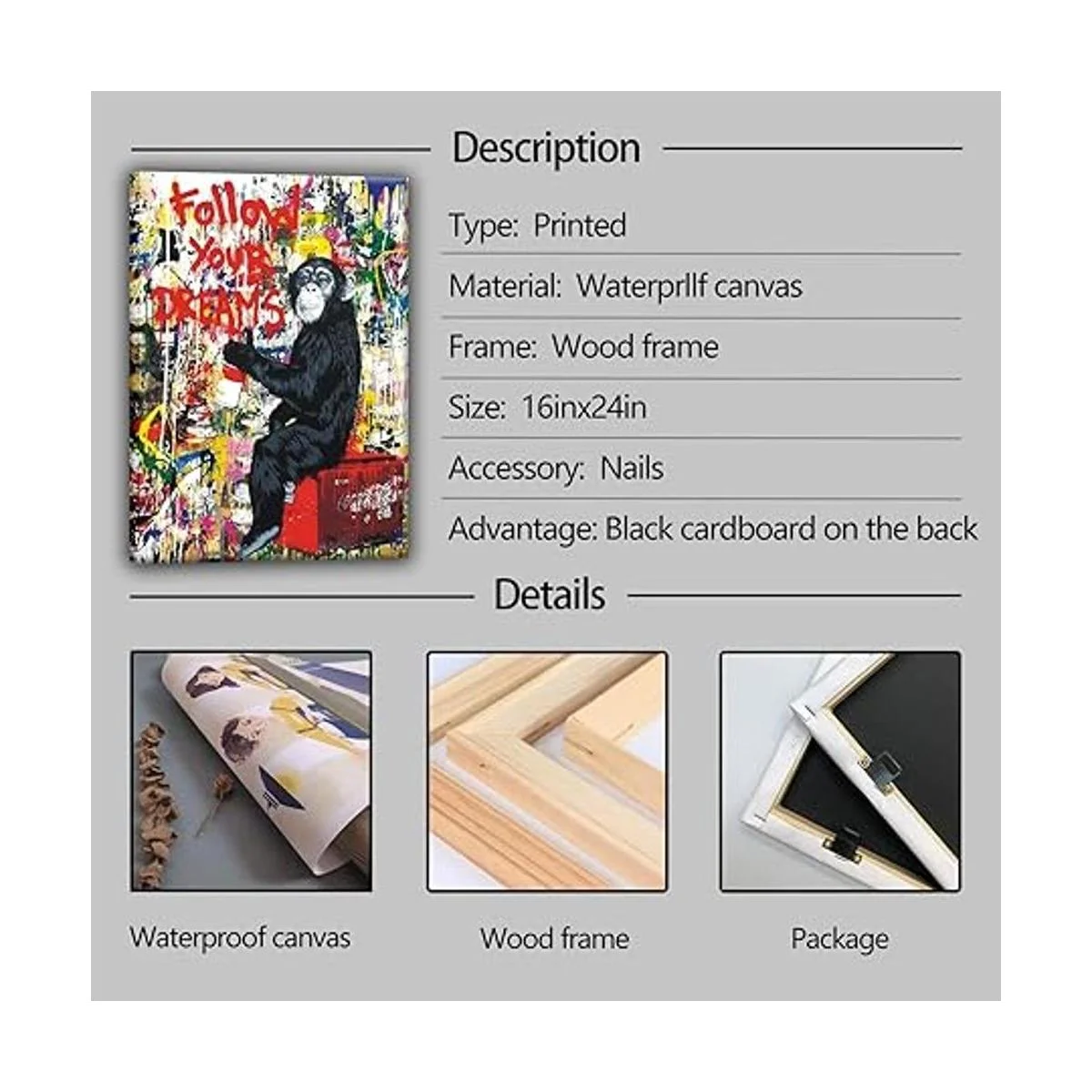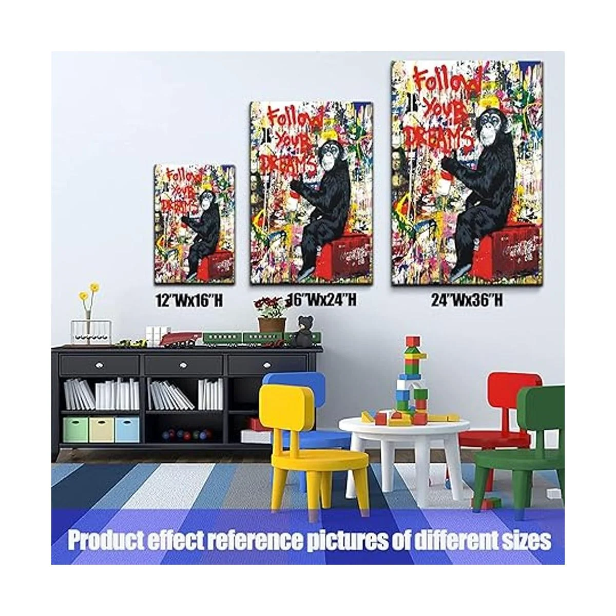 Arte de pared en lienzo de Banksy: Orangután escribe en la pared con graffiti Sigue tus sueños Ya sea que lo cuelgues en la oficina o en el dormitorio, siempre te recuerda, no importa cuál sea tu estado, ten en cuenta tus sueños y no olvides tus intenciones originales. Forja por delante