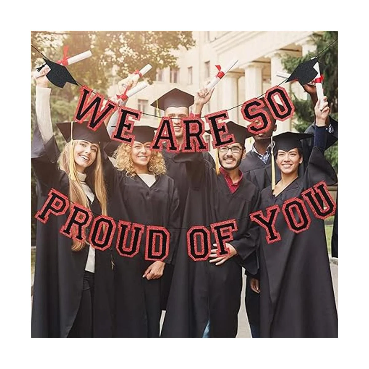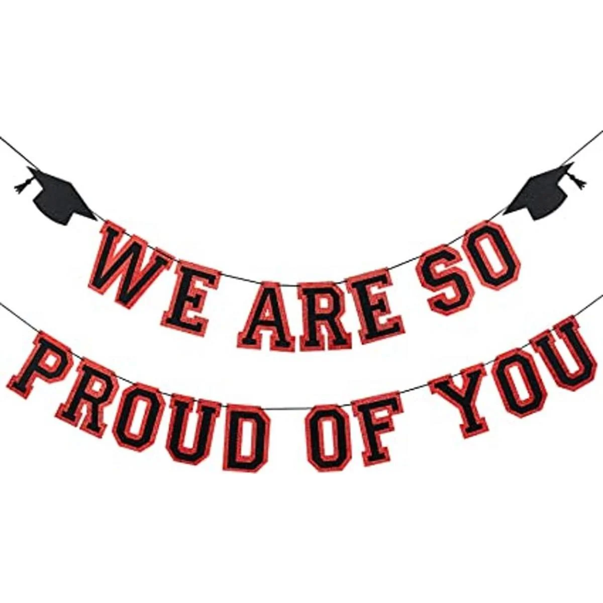 Suministros para fiesta de graduación 2022: 1 pieza de purpurina negra y roja que estamos tan orgullosos de ti, diseño único, perfecto para fiestas de graduación de 2022, ceremonia de graduación de secundaria, decoraciones de graduación universitaria.