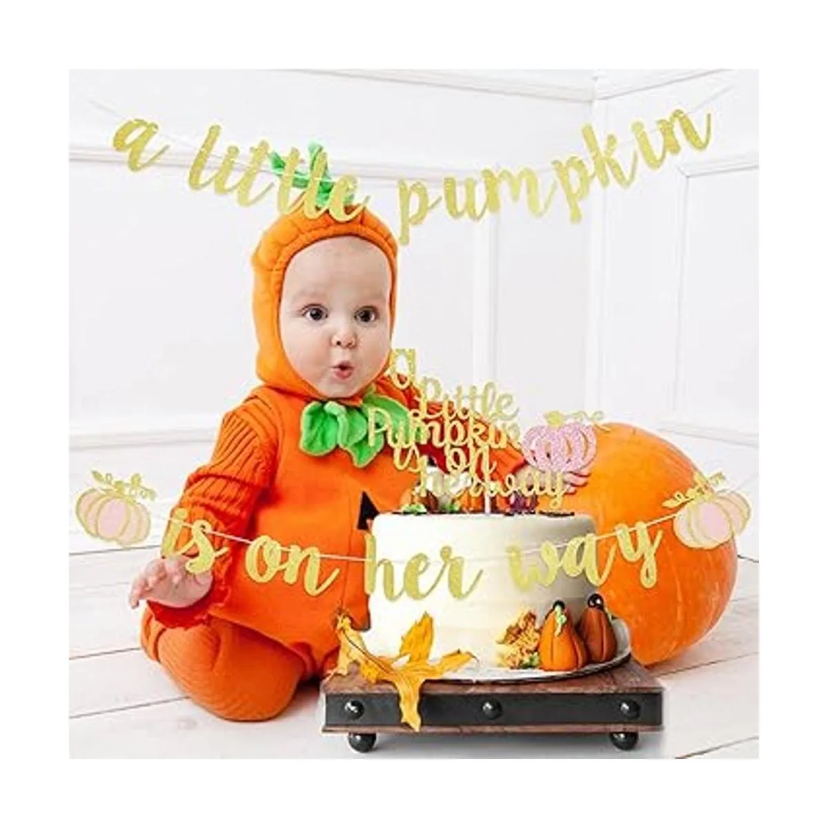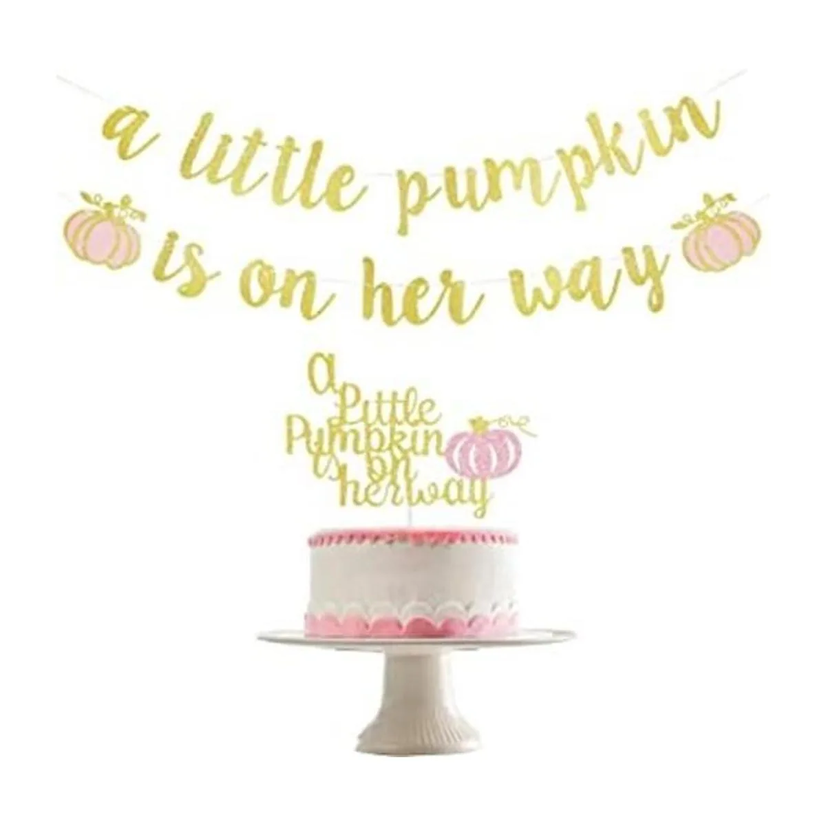 Banner de A Little Pumpkin is On Her Way con purpurina dorada y un poco de calabaza está en camino para pasteles pancarta de calabaza pequeña, decoración de baby shower, decoración de otoño para niña