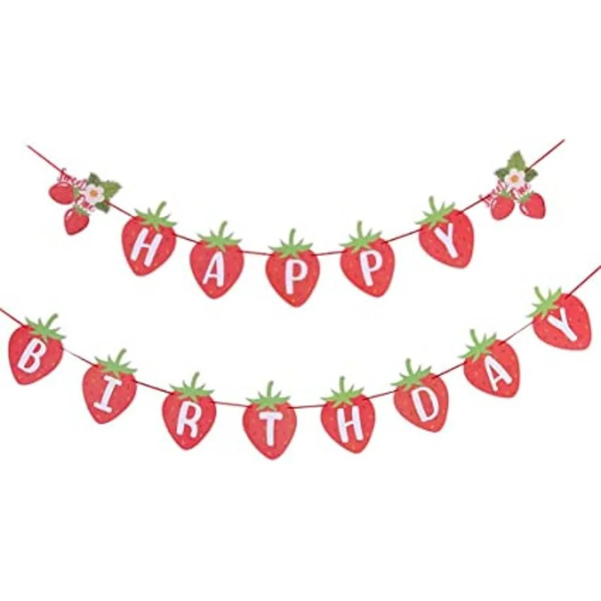 Colores rojo y verde: diseño 2 en 1 para leer Happy Birthday. La pancarta utiliza fresas como imagen de fondo y letras blancas impresas en el centro de cada cartulina.