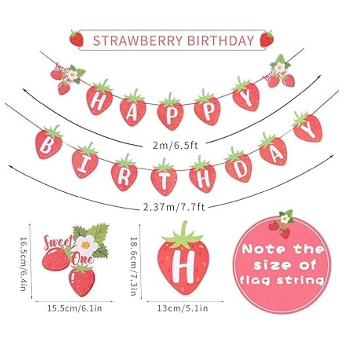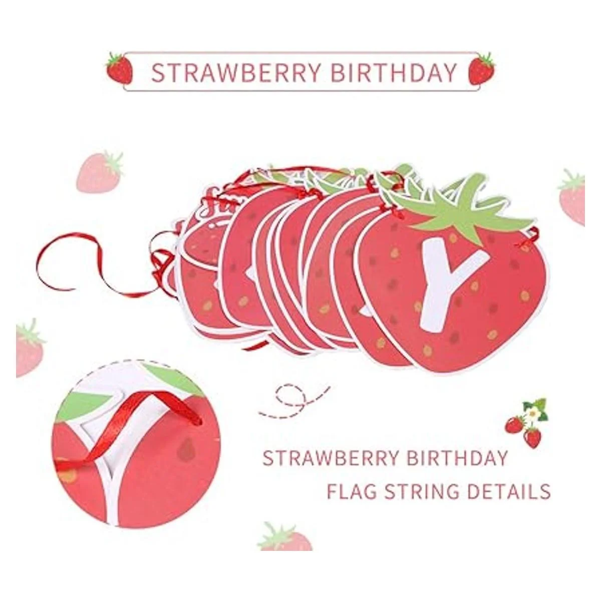 Pancarta de fresa: 15 piezas de pancarta de cumpleaños temática de fresa. Hecho de papel, el tamaño de la bandera individual es de 5.1 x 7.3 pulgadas.