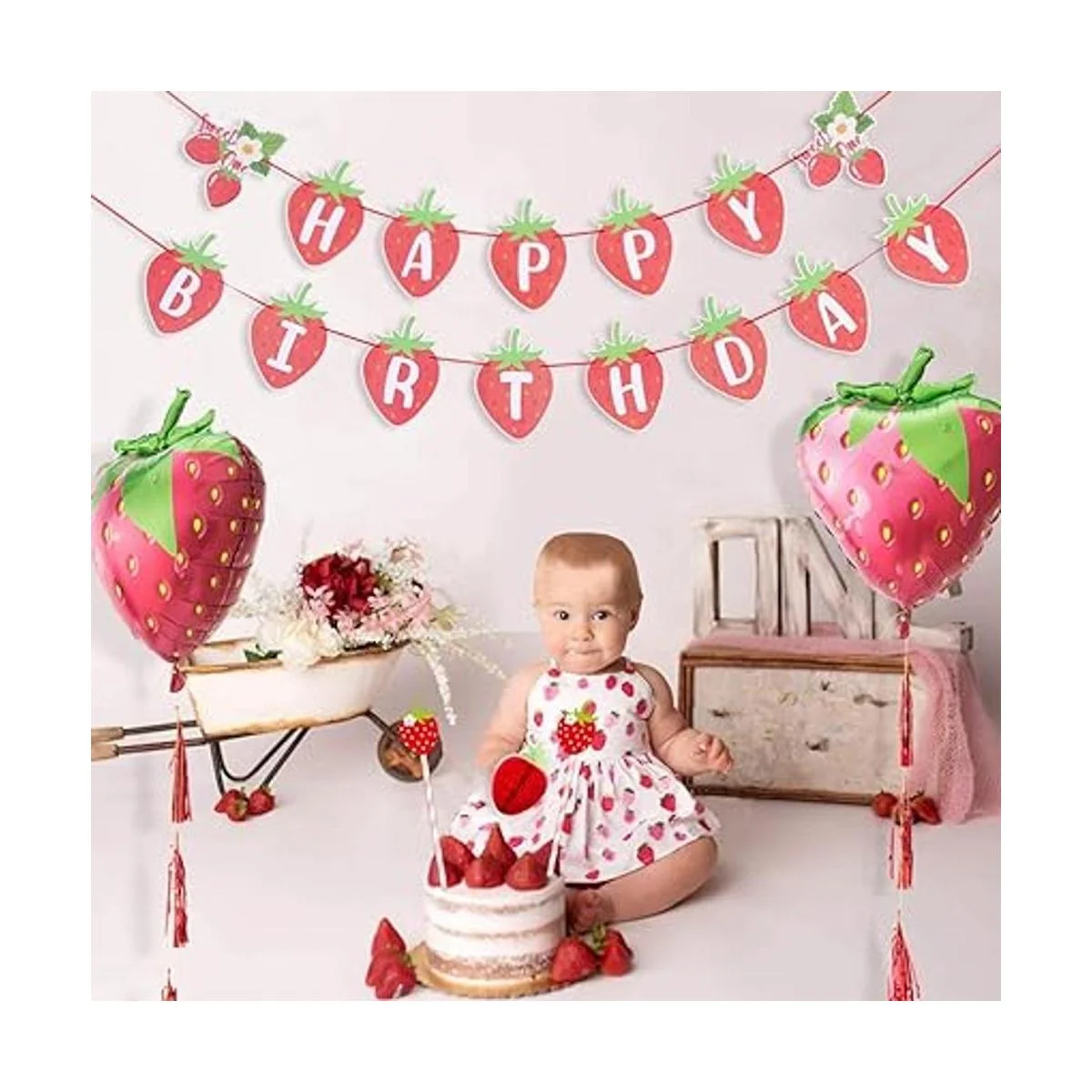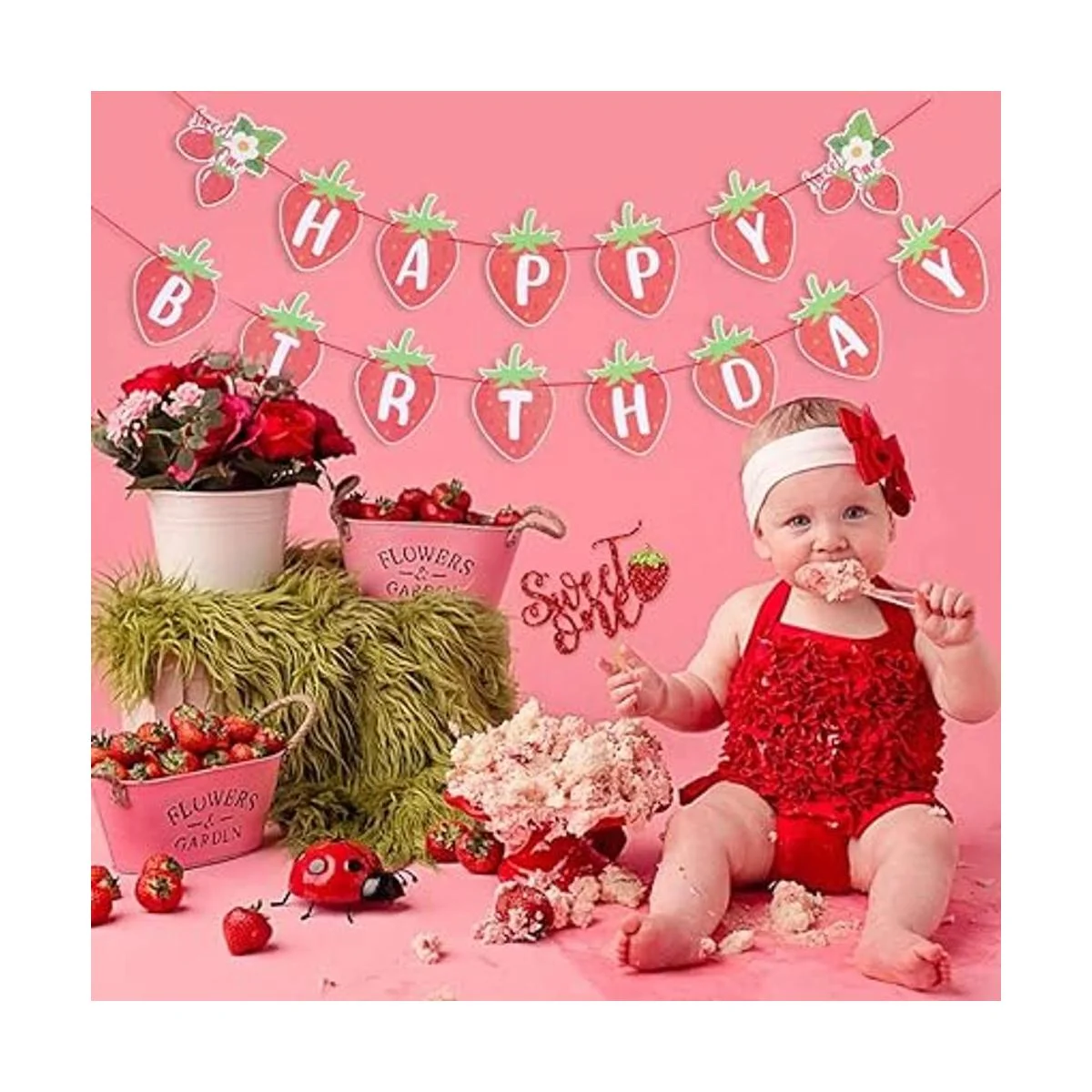 Banner de feliz cumpleaños de fresa con diseño de bayas dulces y bayas dulces para decoración de fiesta de primer cumpleaños, SUNBEAUTY rojo fresa