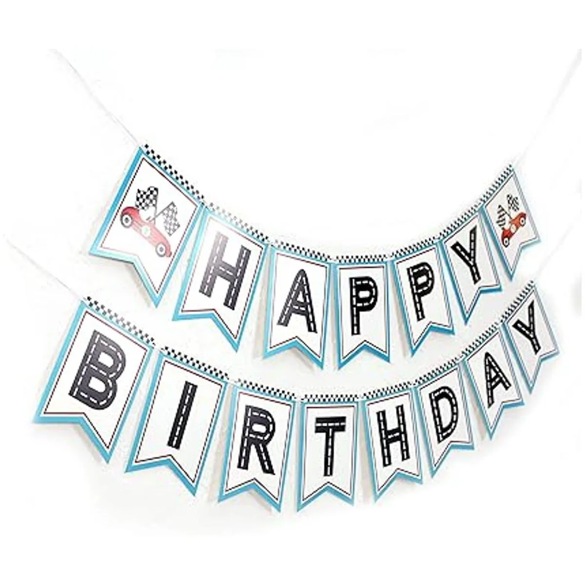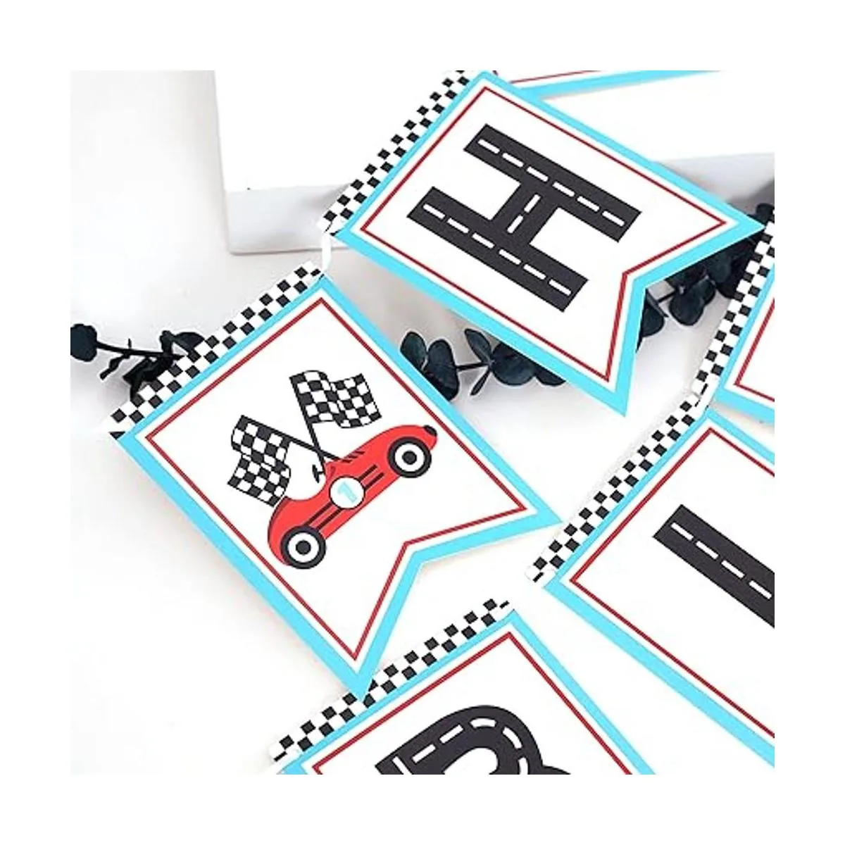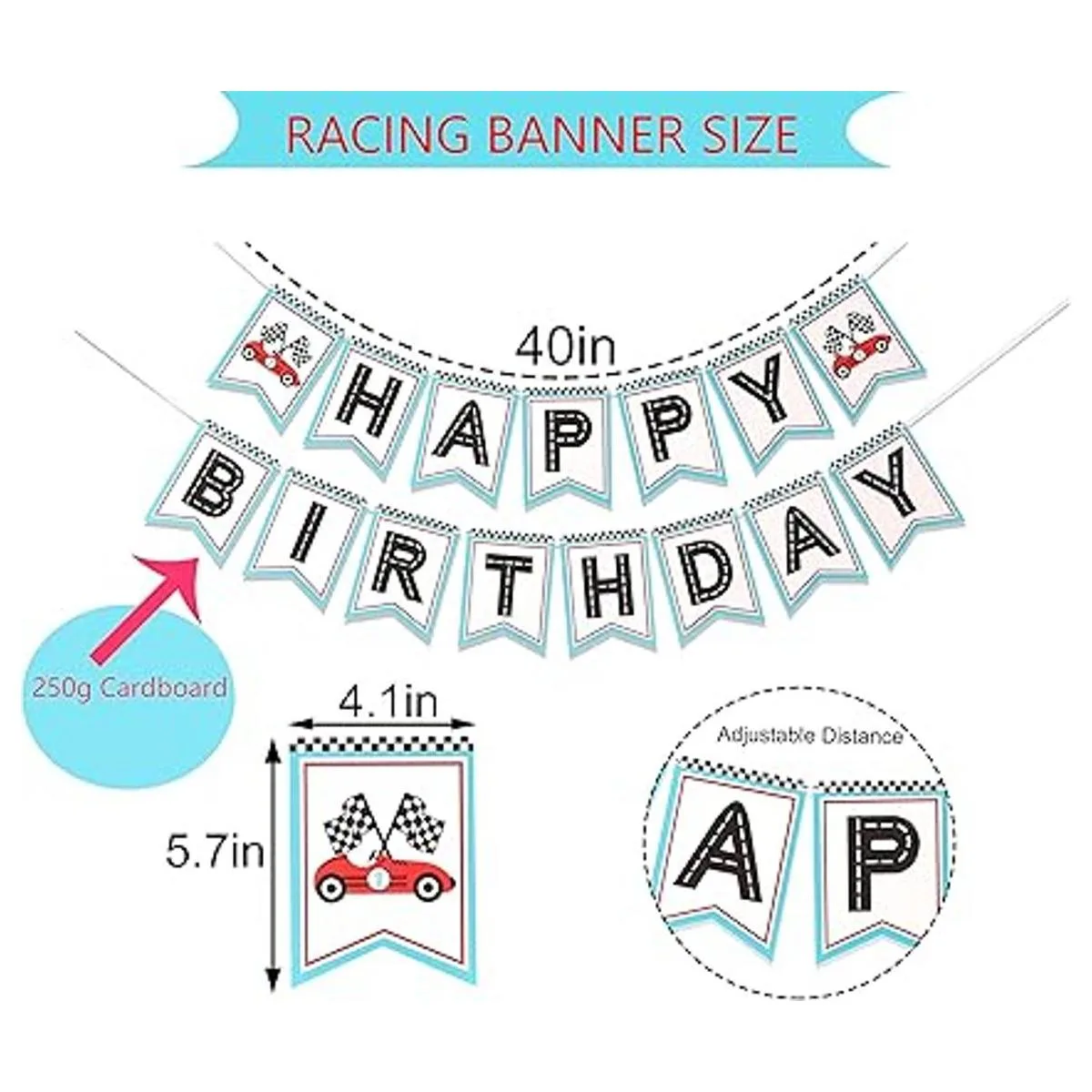 Tamaño de la bandera de carreras de coche: esta pancarta de carreras se divide en dos piezas, el tamaño es de aproximadamente 40 pulgadas, la tarjeta está hecha de cartón de 8.82 oz, y el tamaño de una sola tarjeta es de aproximadamente 4.1 x 5.7 pulgadas. Las banderas no son fijas y puedes ajustarlas según tus necesidades.
