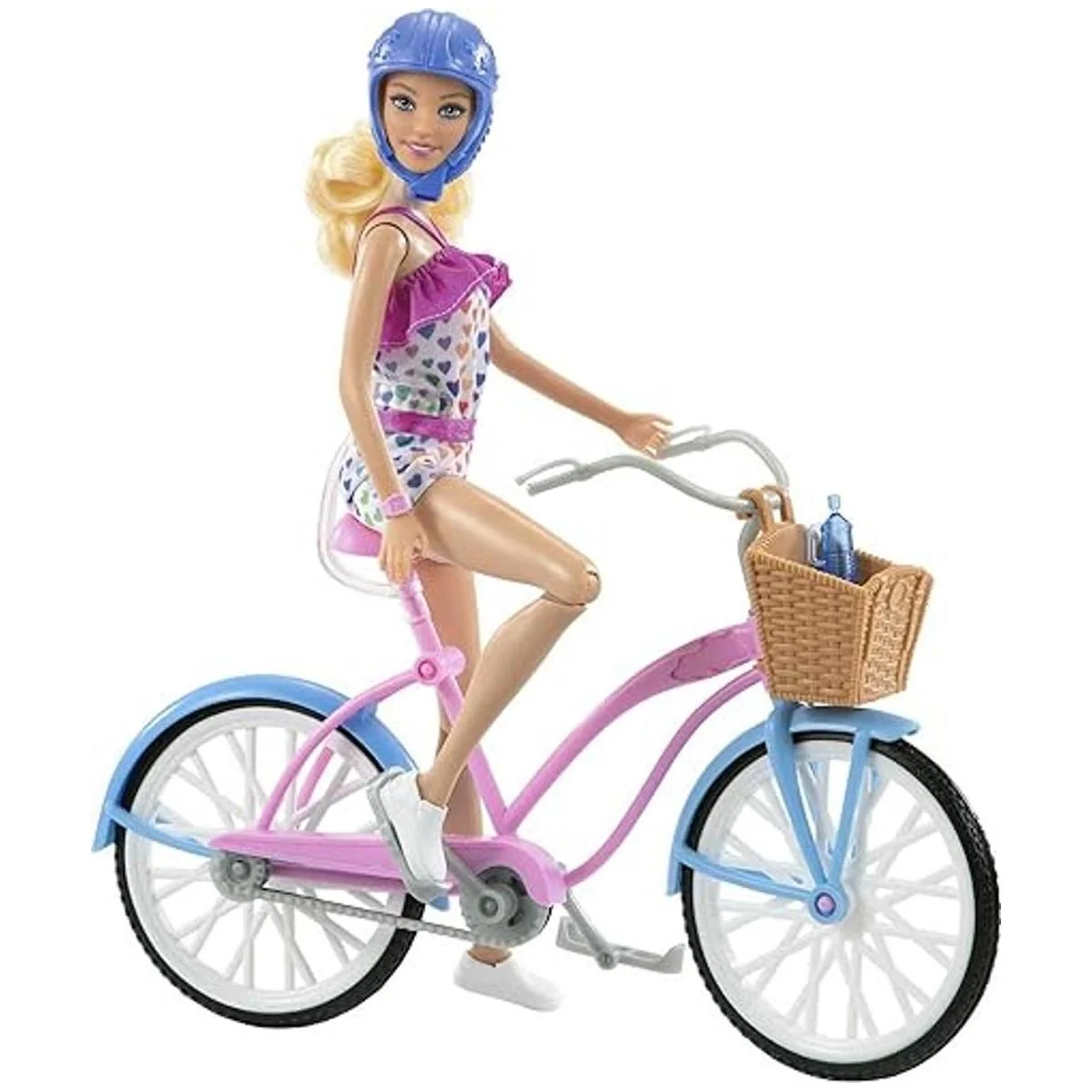 La bicicleta cuenta con un colorido diseño rosa y azul y detalles realistas, como detalles plateados y una cesta dulce.