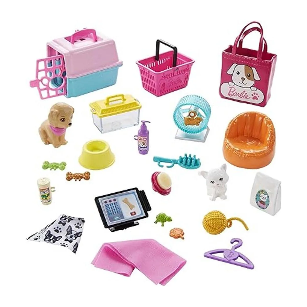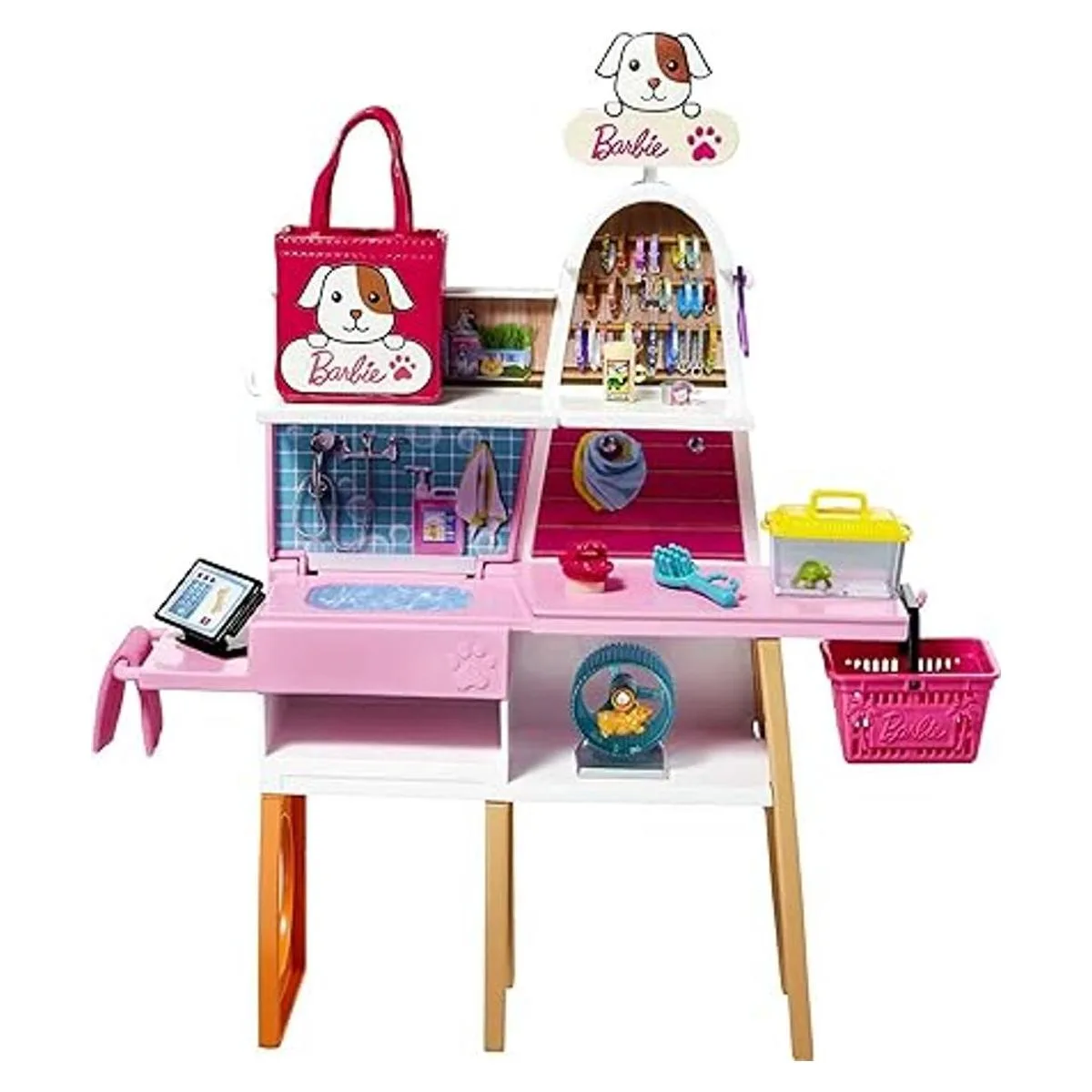 El juego de Barbie Pet Boutique es un sueño para los amantes de los animales, cuenta con 4 mascotas, una estación de aseo, caja registradora y más de 20 piezas de juego temáticas.