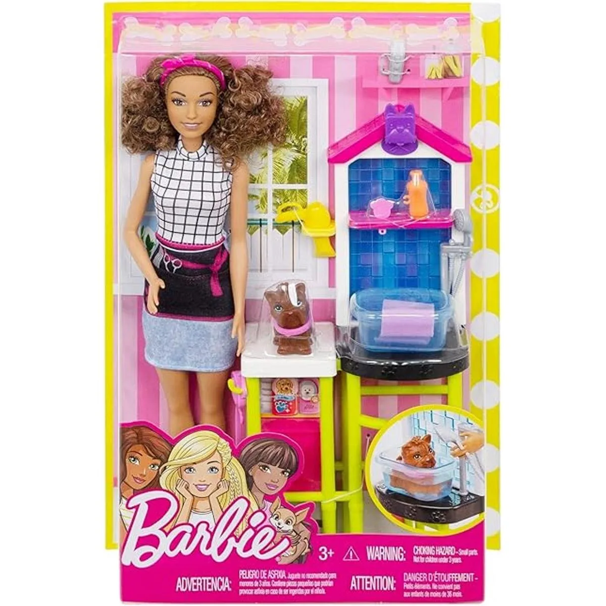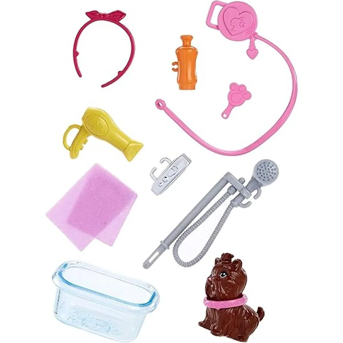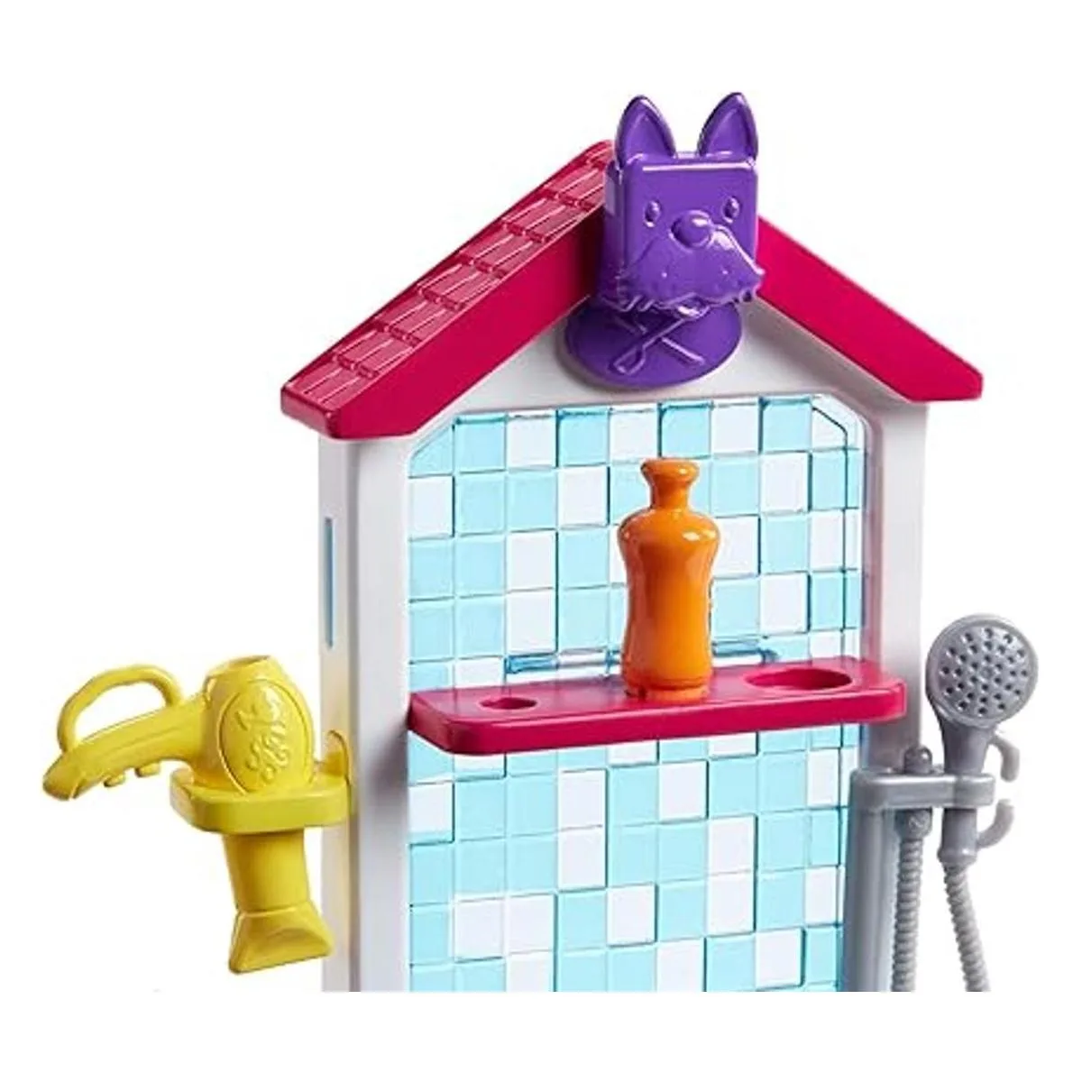 La muñeca Barbie y el juego de aseo para mascotas viene con una figura de cachorro y estación de aseo que tiene una manguera plateada y una bañera extraíble para llenar con agua; la colorida pieza de mobiliario tiene un estante, almacenamiento y una barra para toallas.