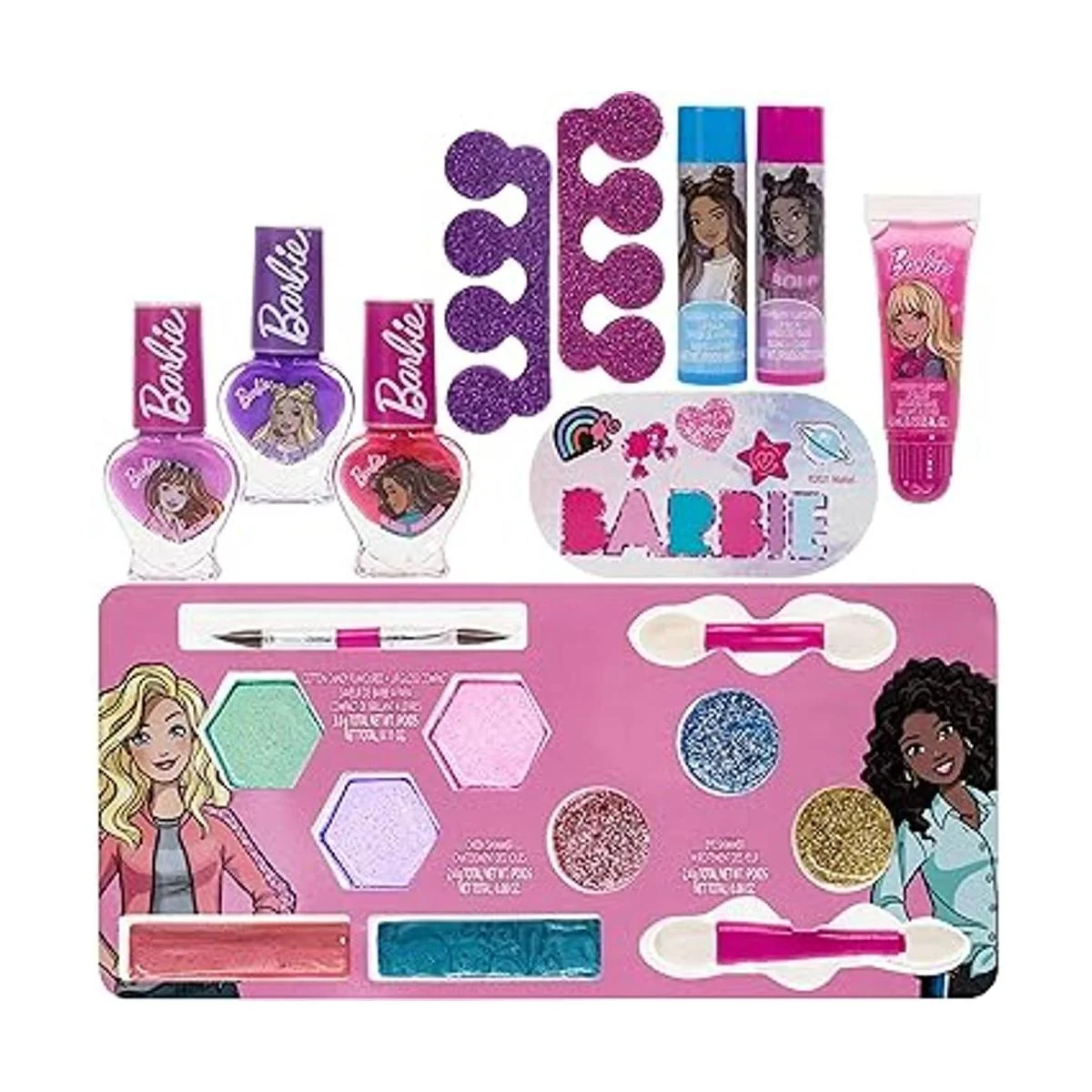 El kit incluye: El maletín de tren incluye 2 separadores de dedos de color púrpura y rosa, con purpurina. 1 tubo para labios: Purpurina rosa sabor a fresa. 2 barras de labios: Brillo azul sabor a arándano Brillo rosa sabor a fresa. 3 esmaltes de uñas despegables: Brillo melocotón, brillo púrpura, brillo rosa con aroma a chicle. 1 lima de uñas con arte de Barbie en la parte delantera. 3 brillos de ojos: Purpurina rosa, purpurina azul, purpurina dorada. 3 brillos labiales: Purpurina verde azulado, purpurina púrpura claro, purpurina rosa sabor a caramelo. Ver descripción para más información
