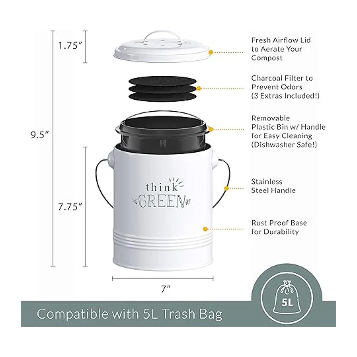 Dimensiones: nuestros pequeños contenedores de compost para cocina miden 7 pulgadas de profundidad x 9.5 pulgadas de alto con tapa. Altura sin tapa: 7.75 pulgadas de alto. Diseñado para uso en interiores. Material: Acero galvanizado. Resistente al óxido. Tamaño recomendado de la bolsa de compost: 5 litros/1.2 galones. Color: el cuerpo es blanco mate. El color del texto es Verde. Pantone 5487C.