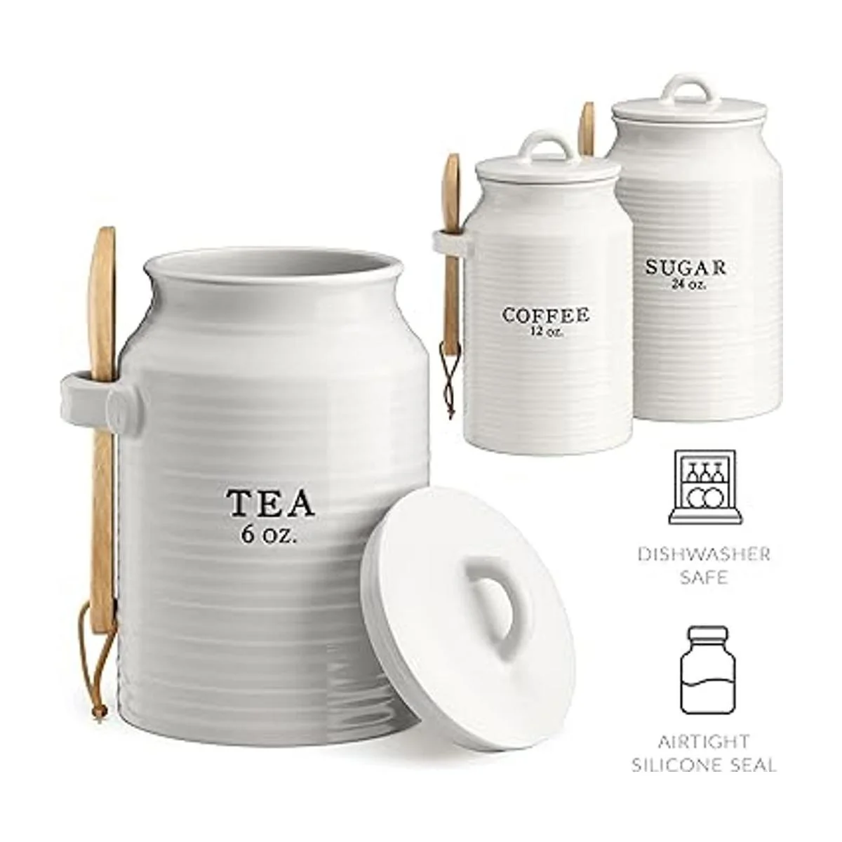 Barnyard Designs Juego de recipientes de cocina, recipientes de cerámica herméticos con cucharas de madera, café decorativo, azúcar y almacenamiento de té para encimera, decoración de granja, 6.75 pulgadas de alto, 7.75 pulgadas de alto, blanco, juego de 3