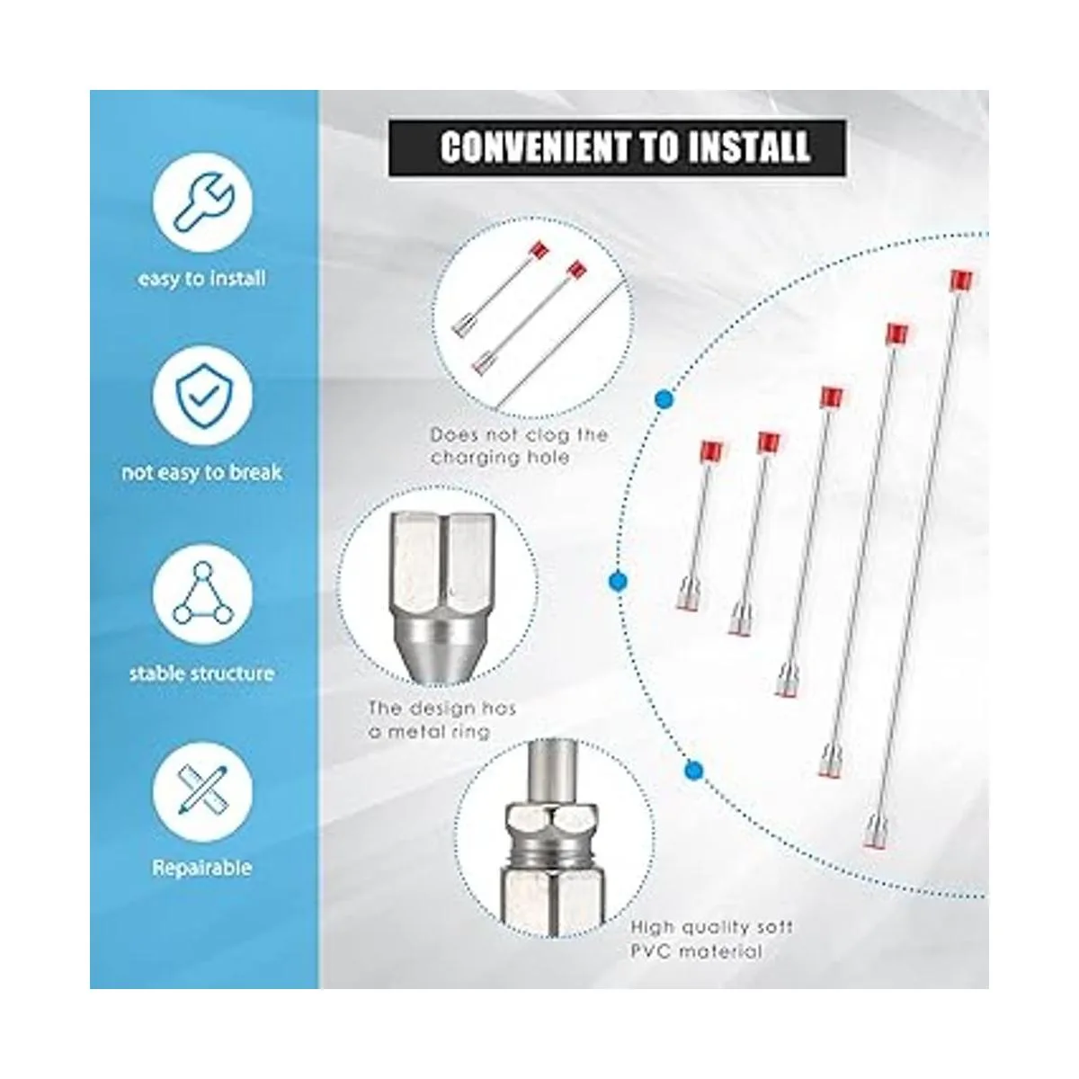 5 tamaños para usar: hay 5 tamaños de estas extensiones para pulverizadora, a saber, aproximadamente 39.4 in, 29.5 in, 19.7 in, 11.8 in, 7.9 in, y la rosca es de aproximadamente 7/8 pulgadas, adecuado para la mayoría de s pulverizadoras sin aire. s con 7/80 c rosca de pulgadas