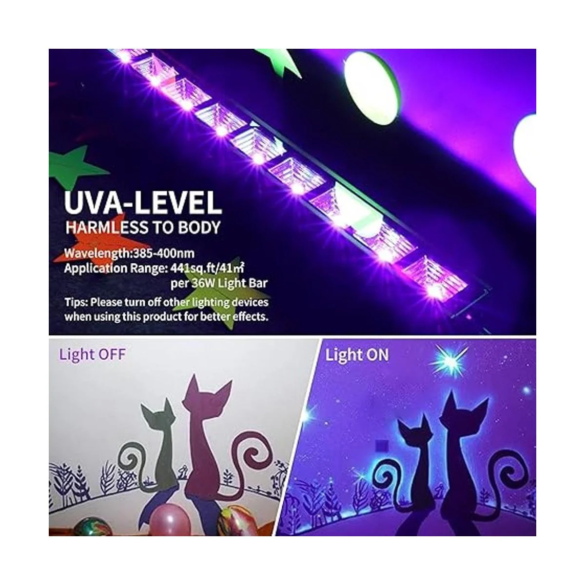 Esta barra de luz negra mejorada de 36 W con LED de alta calidad, proporciona un ángulo de haz amplio de 120 grados, 50.000 horas de vida útil. Diseño mejorado con 2 LED en una fila, más potente.