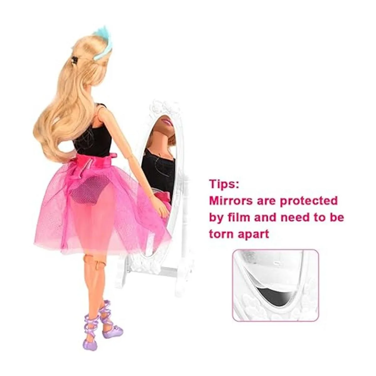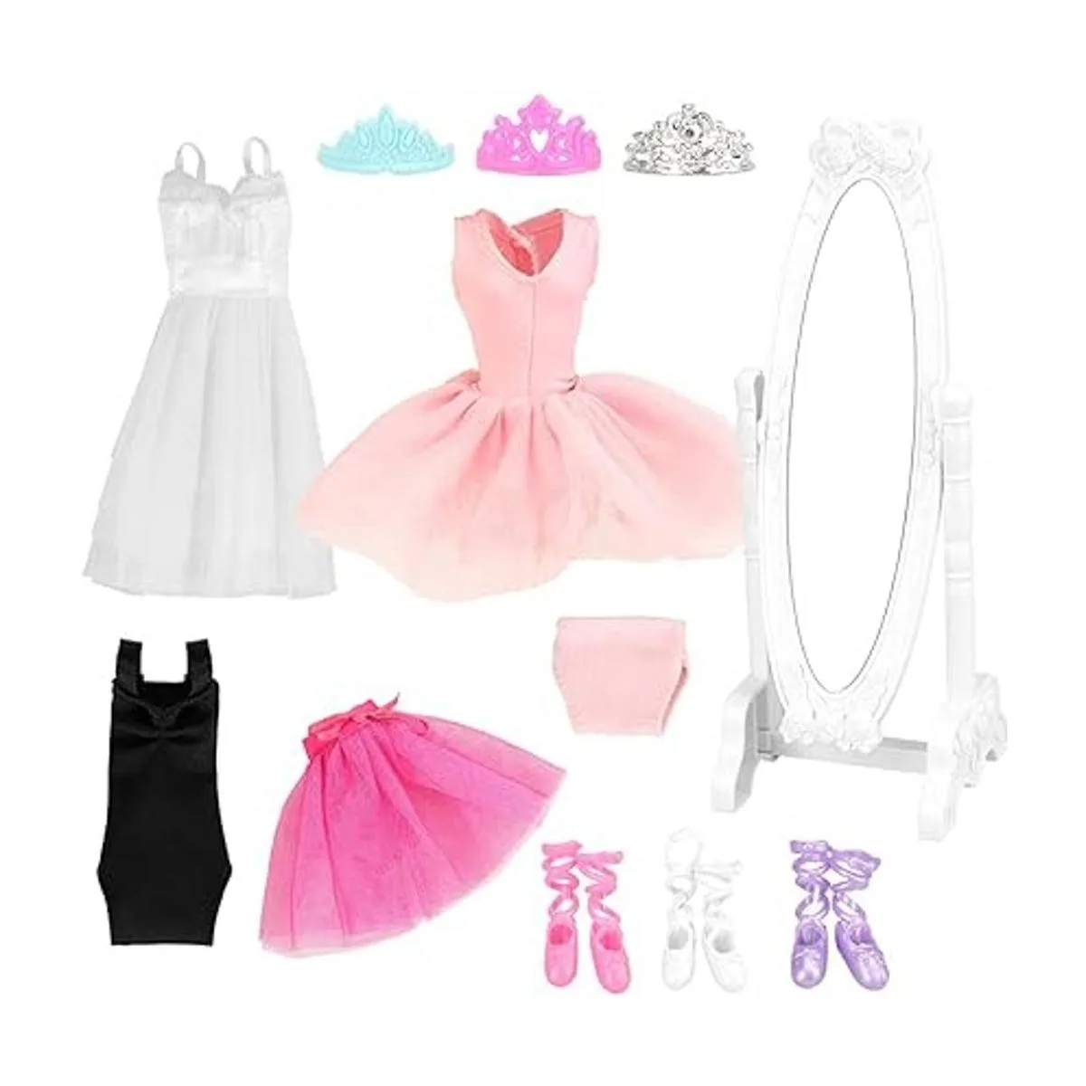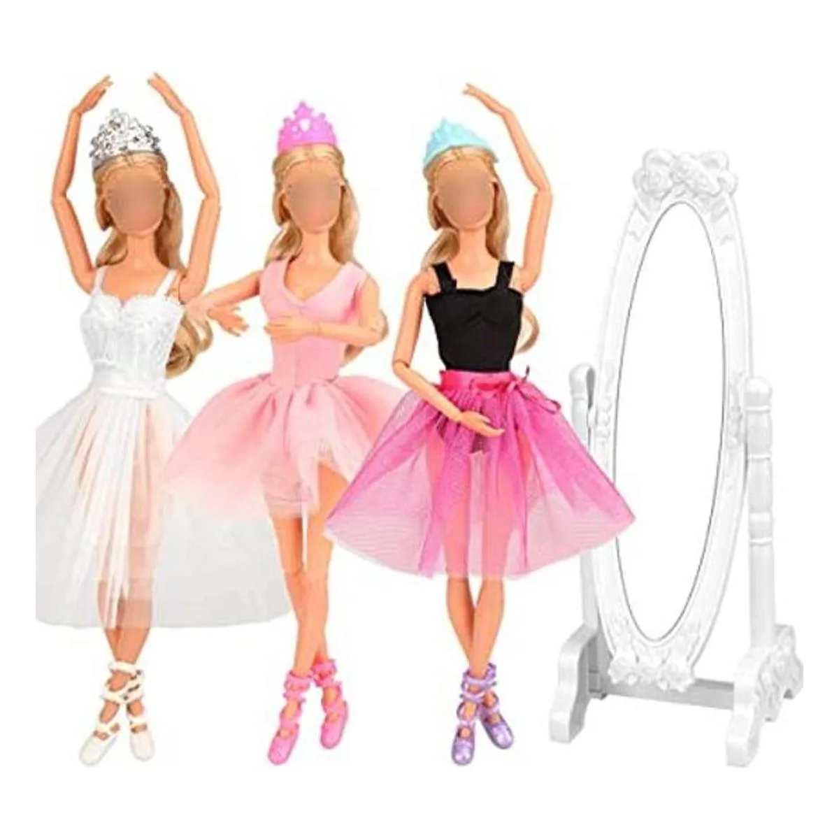 Lo que puedes obtener: 3 juegos lote de 10 ropa de muñeca de bailarina y accesorios para muñeca de niña de 11.5 pulgadas vestido de ballet blanco trajes de bailarina rosa vestido negro falda tutú, zapatos de ballet de 3 colores, 3 multitudes de colores, 1 espejo de muebles de casa de muñecas, muñecas no incluidas