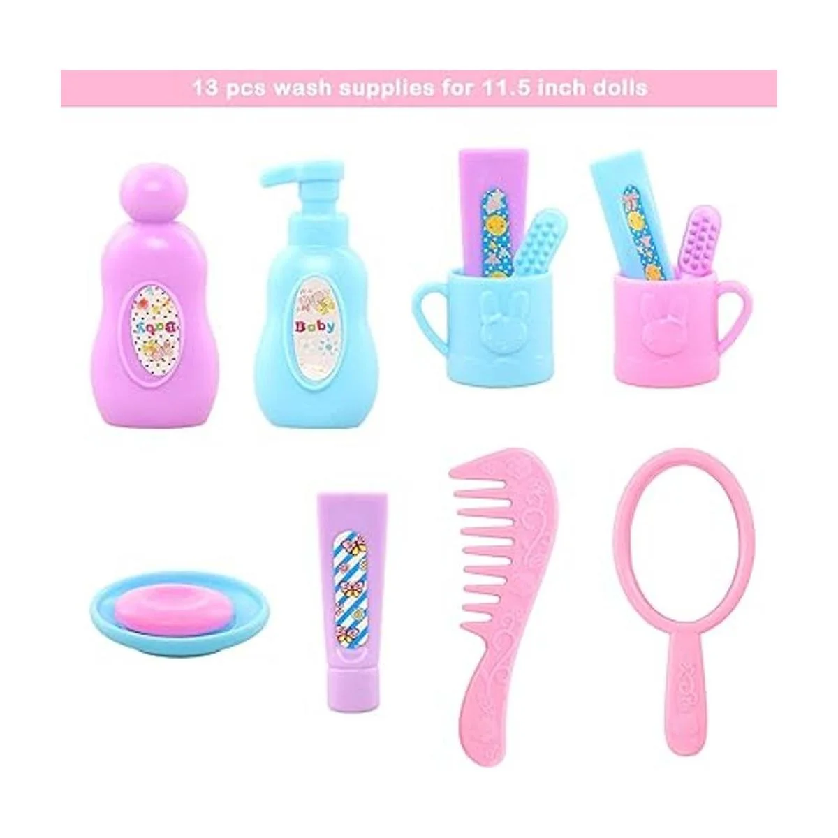 Lo que puedes obtener: juego de viaje de 18 piezas 13 piezas de suministros de lavado 13 piezas de accesorios para cámara, total 43 piezas de accesorios para muñecas de 11.5 pulgadas