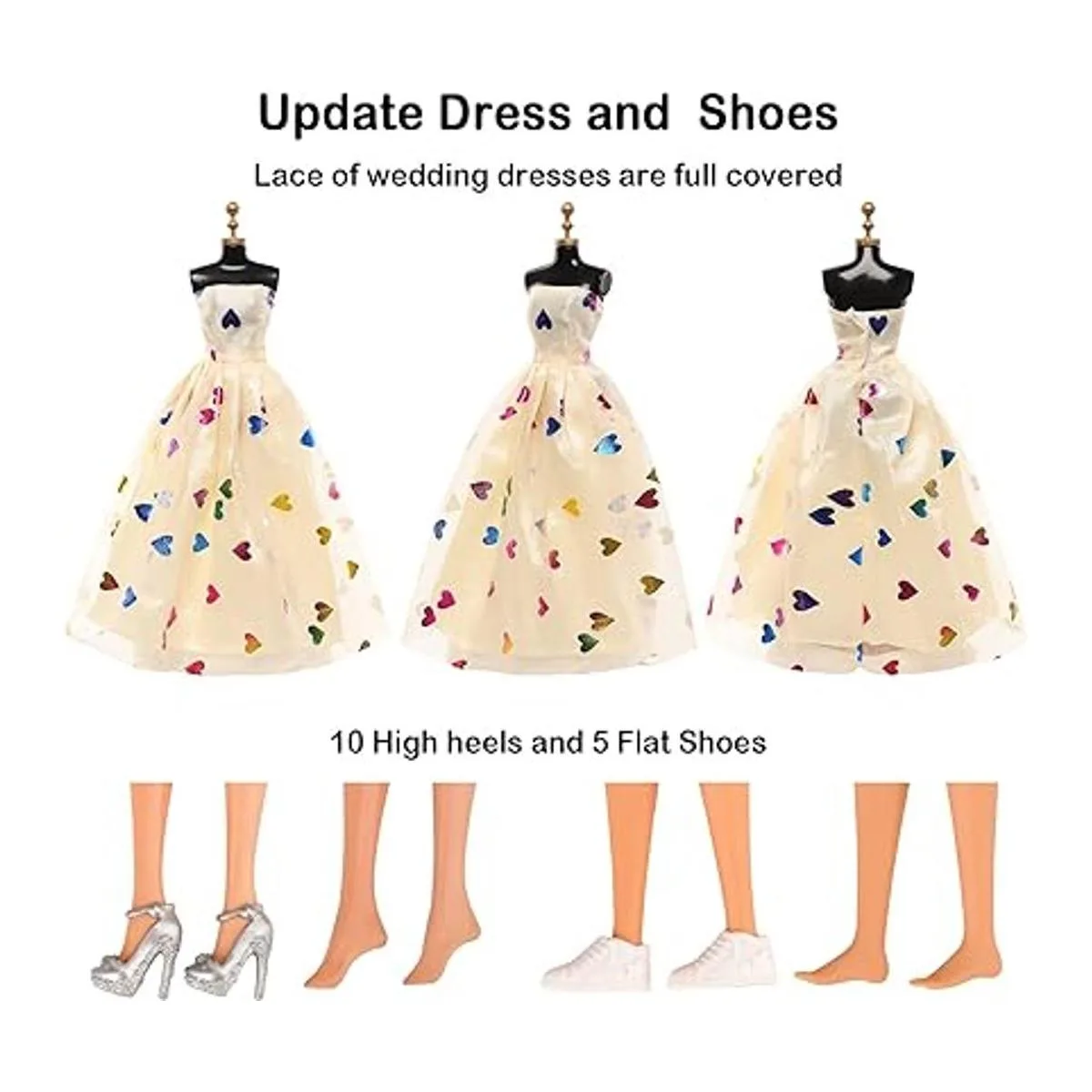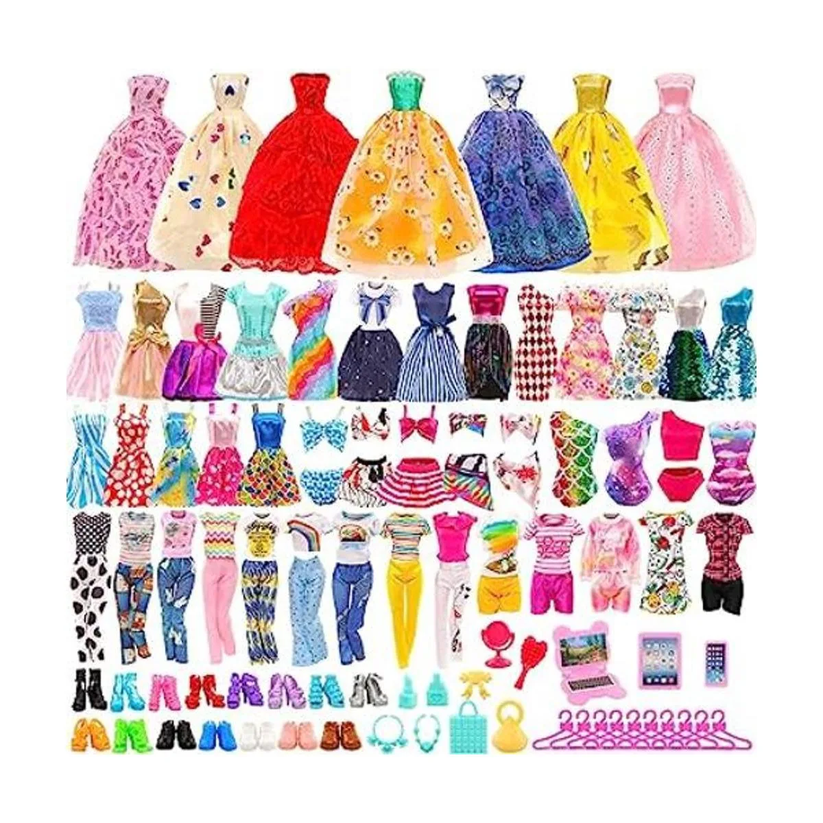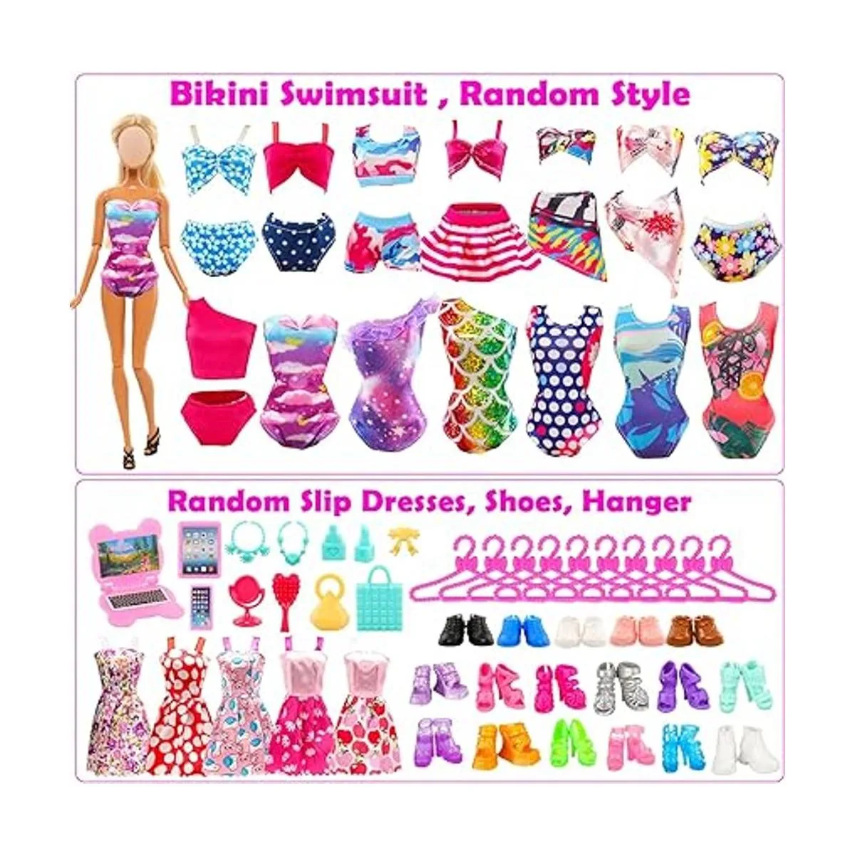 BARWA Paquete de 57 ropa y accesorios para muñecas, 5 vestidos de moda, 4 blusas, 4 pantalones, 3 vestidos de boda, 3 trajes de baño, bikini, 5 minivestidos, 10 colgadores, 15 zapatos, cosméticos de computadora para muñecas de 11.5 pulgadas