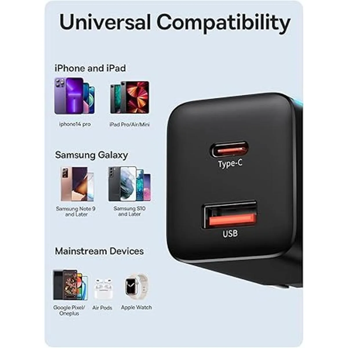 Baseus Cargador USB C, bloque de cargador USB C de doble puerto de 30 W, cargador PD compacto rápido con enchufe plegable para iPad ProAirMini, iPhone 1414 Pro14 Pro Max13 Pro12SE11XRXS, Samsung, Pixel 6, negro