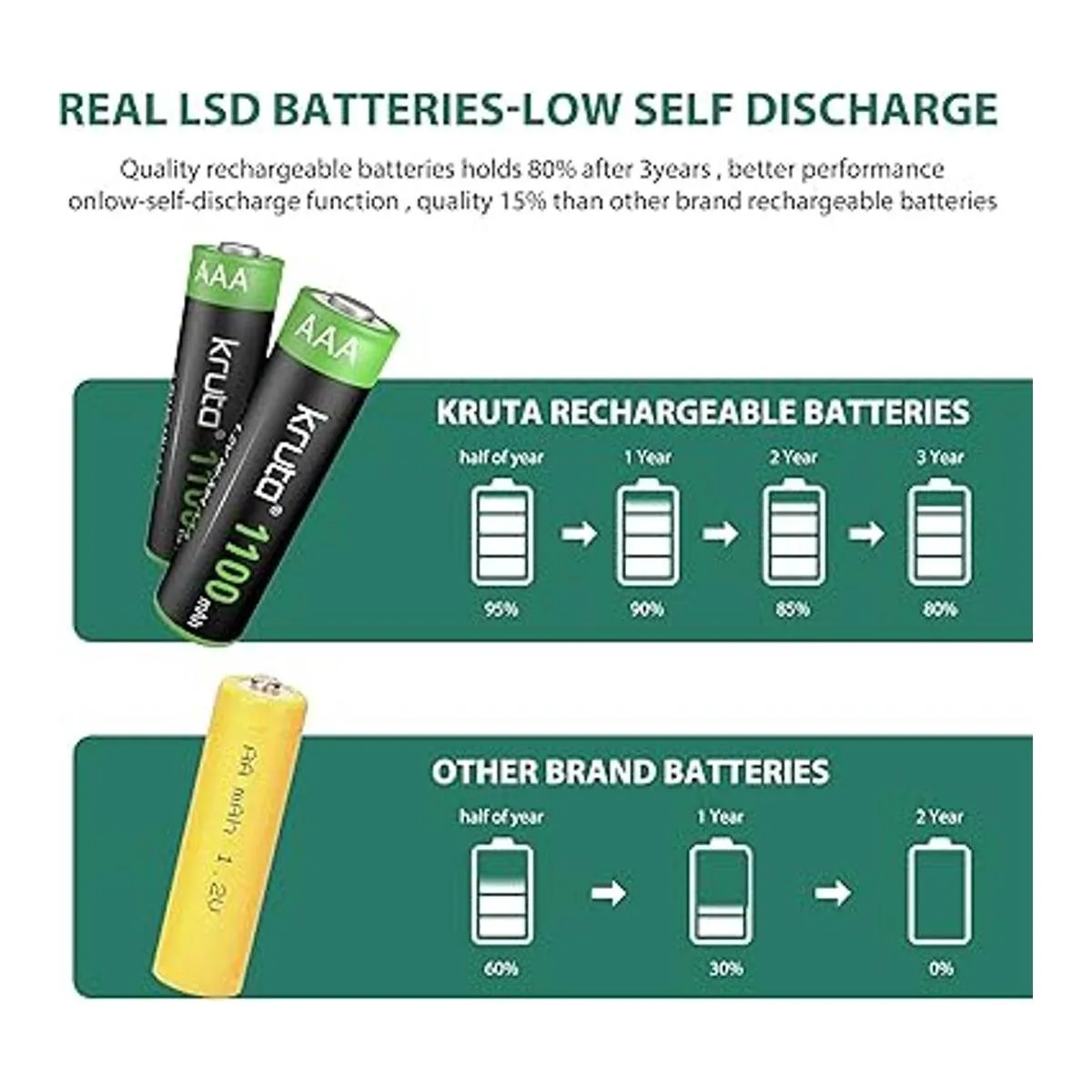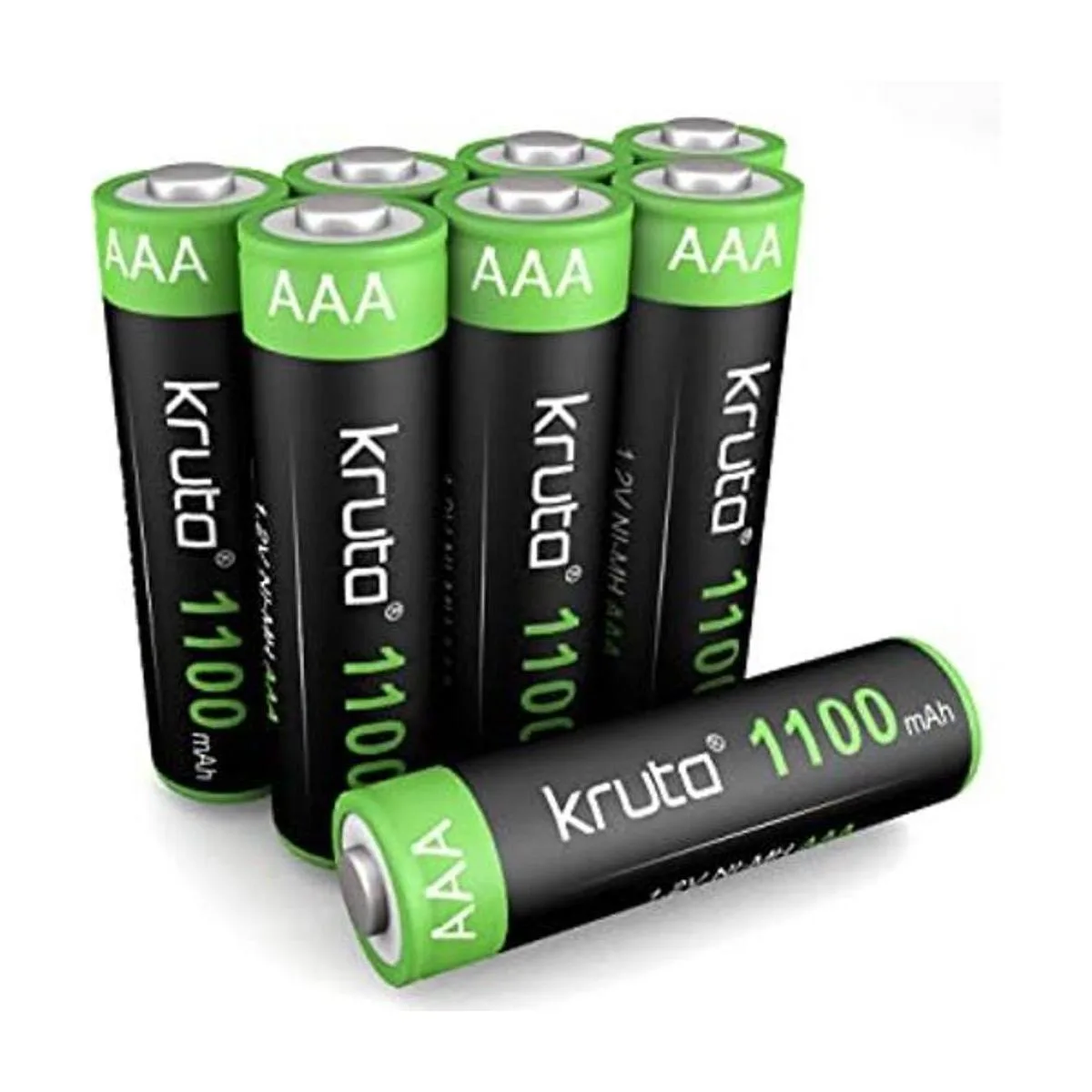 Alta capacidad y larga duración: 8 paquetes de baterías recargables Kruta de 1,2 V AAA 1100 mAh NiMH. Reemplaza todas las baterías alcalinas de 300 mAh, 600 mAh, 1100 mAh, Nicd y NIMH AAA.