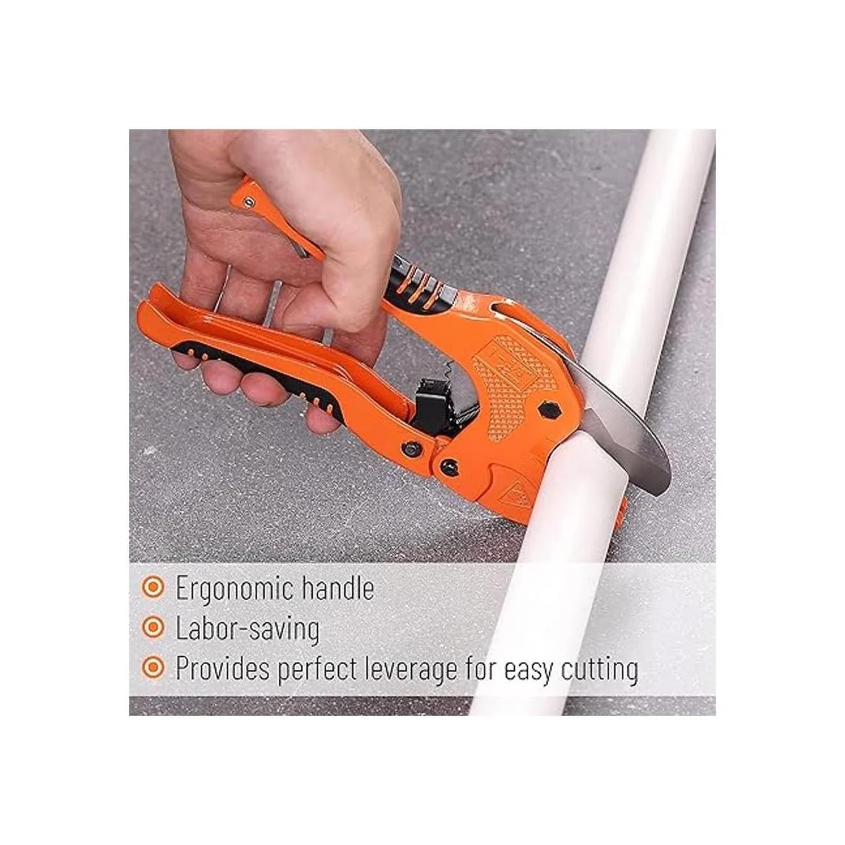 El mango texturizado de goma es cómodo de usar, fiable de sostener y no es fácil de dañar. Una hebilla de acero inoxidable está en la parte inferior del cortador de tubos para un fácil almacenamiento. Cuando no lo utilices, puedes encoger las asas en ambos lados y bloquear el bloqueo de seguridad para ahorrar espacio y evitar lesiones accidentales.