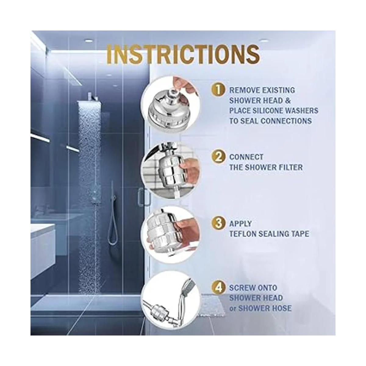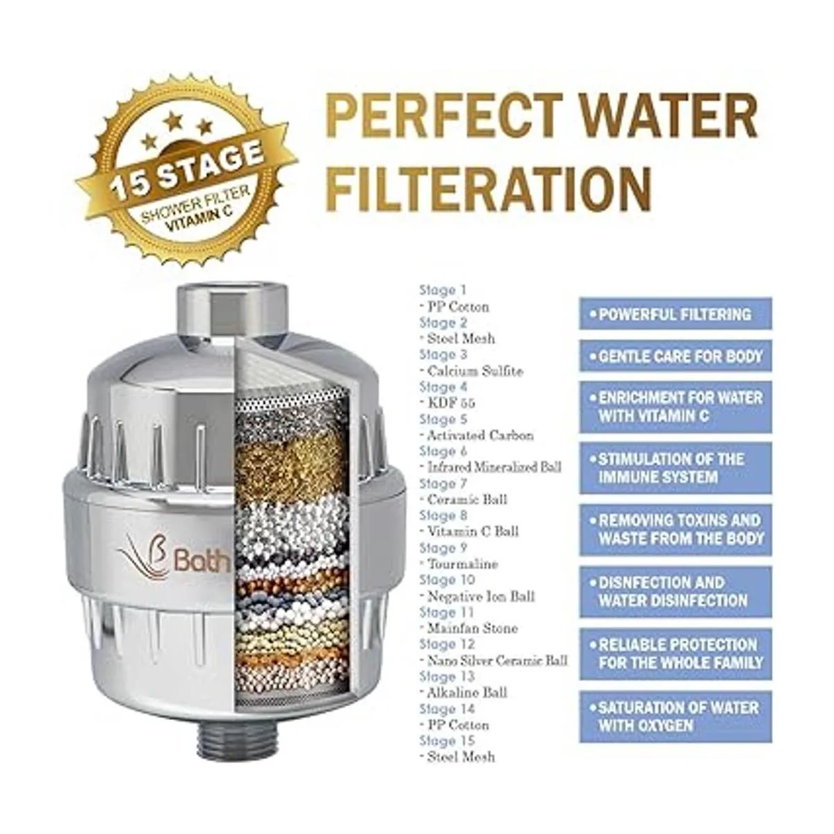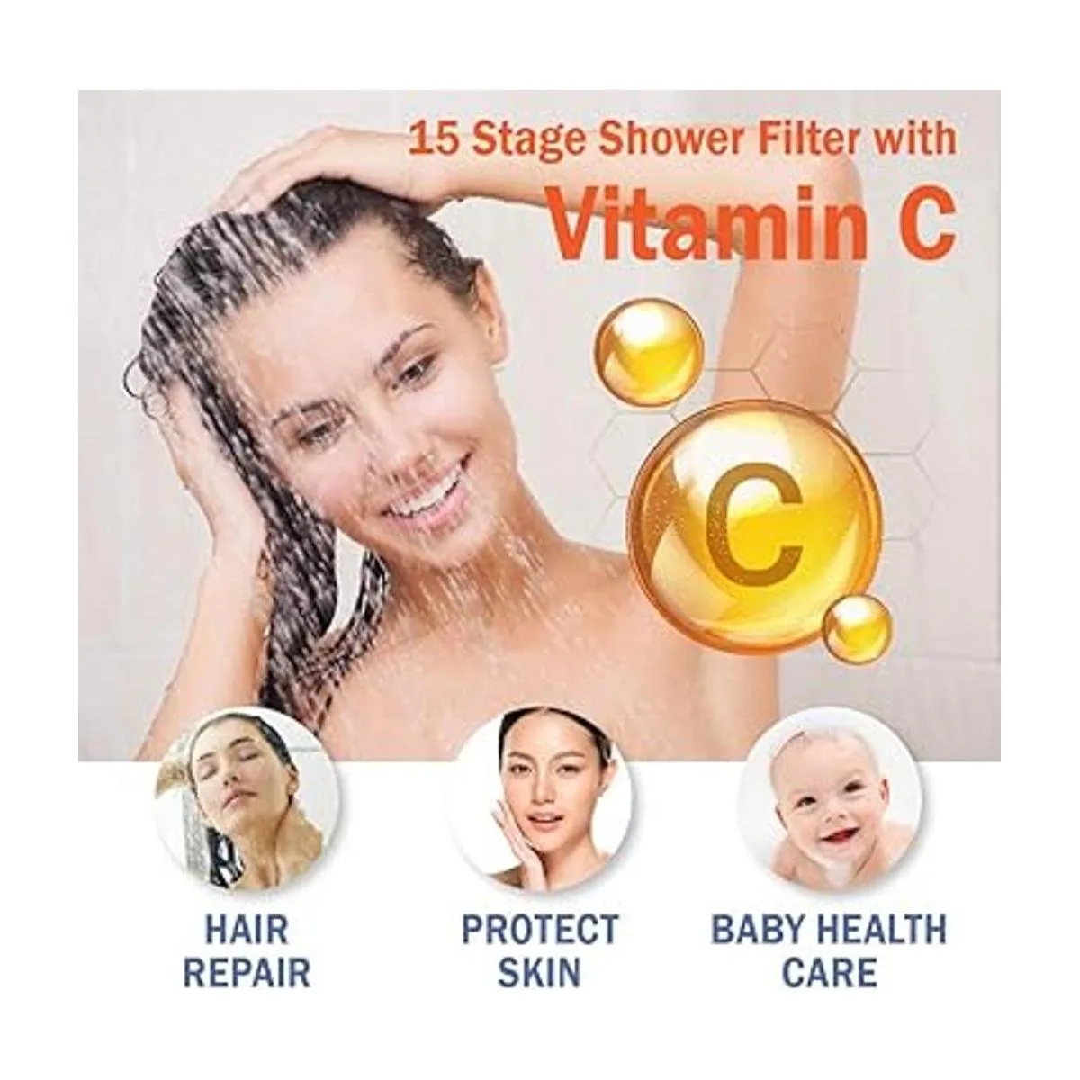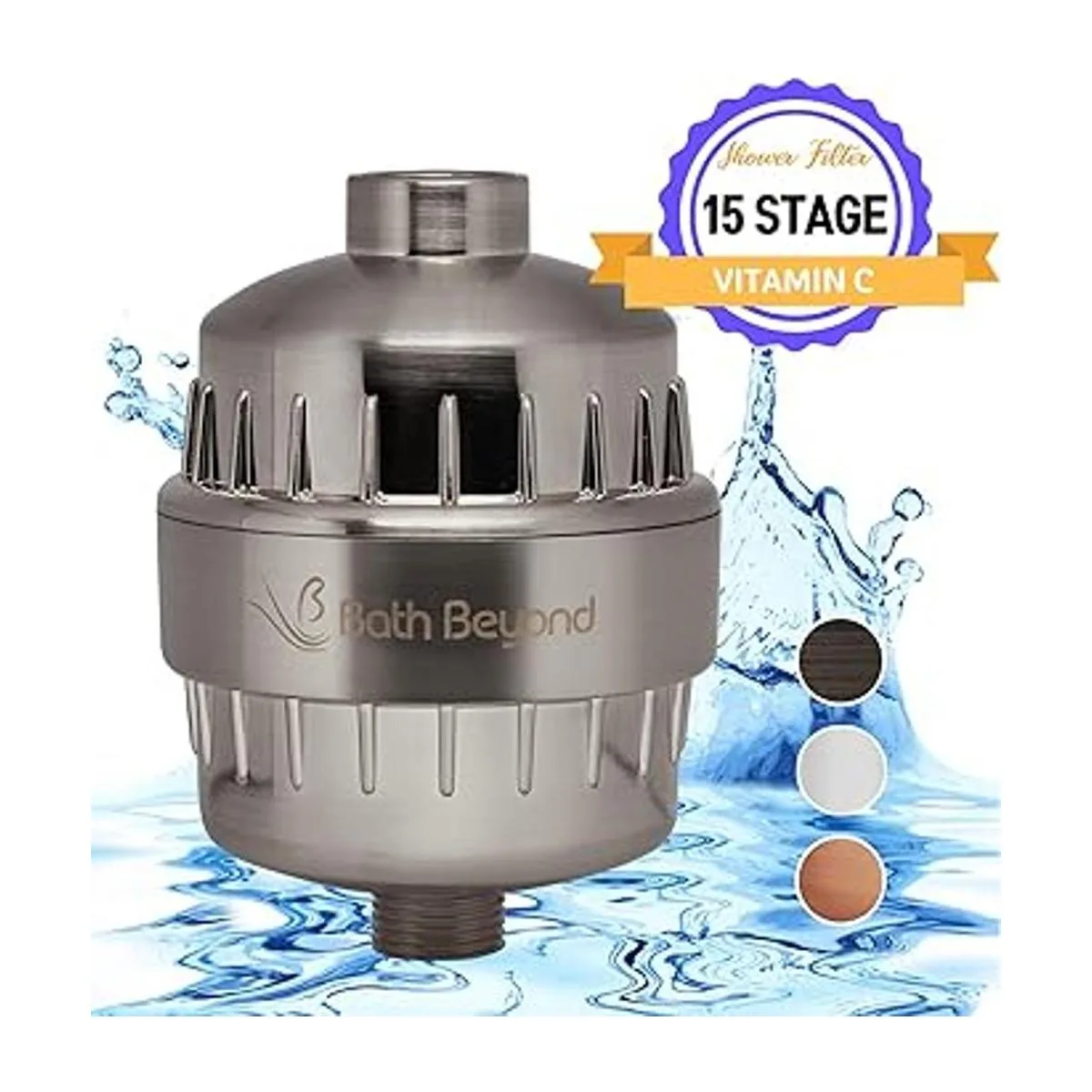 Bath Beyond Filtro de ducha de vitamina C de 15 etapas de alto rendimiento con cartucho para agua dura, filtro de cabezal de ducha elimina el fluoruro de cloro y mejora la condición de tu piel, cabello