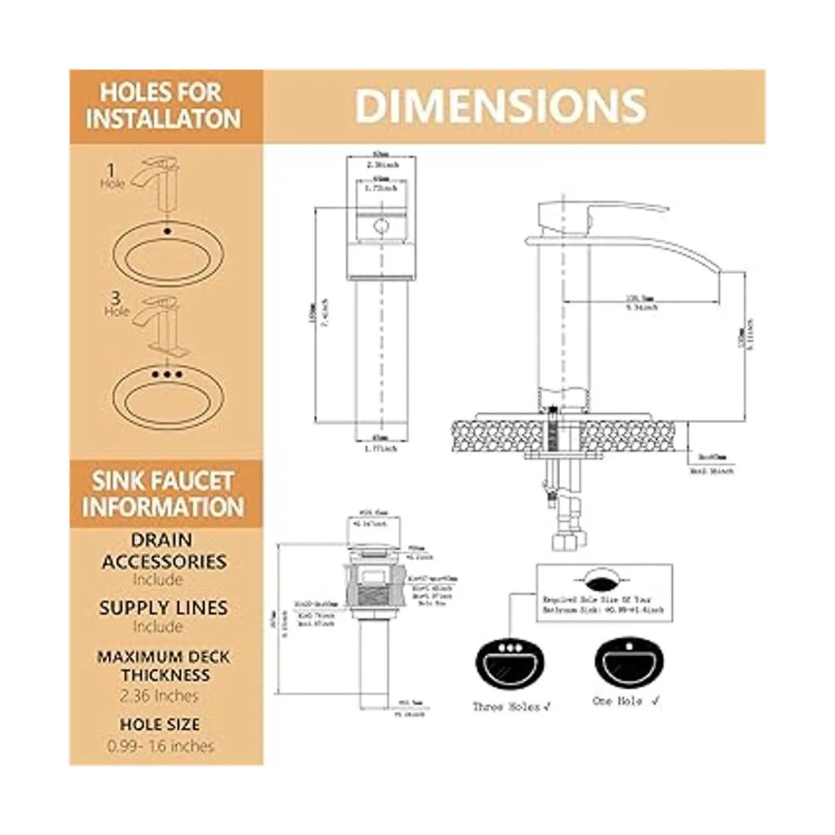 Instalación de cubierta de un solo agujero: el tamaño del agujero de instalación de un solo agujero es de entre 0.9 y 1.6 pulgadas y también tenemos una placa de cubierta de orificio de 6 pulgadas. Si eliges un grifo de 3 agujeros antes, también puedes instalarlo y usarlo. Debes asegurarte de que la distancia horizontal máxima requerida es de 6.3 pulgadas. Tenemos un servicio posventa las 24 horas para responder rápidamente a las preguntas del producto.