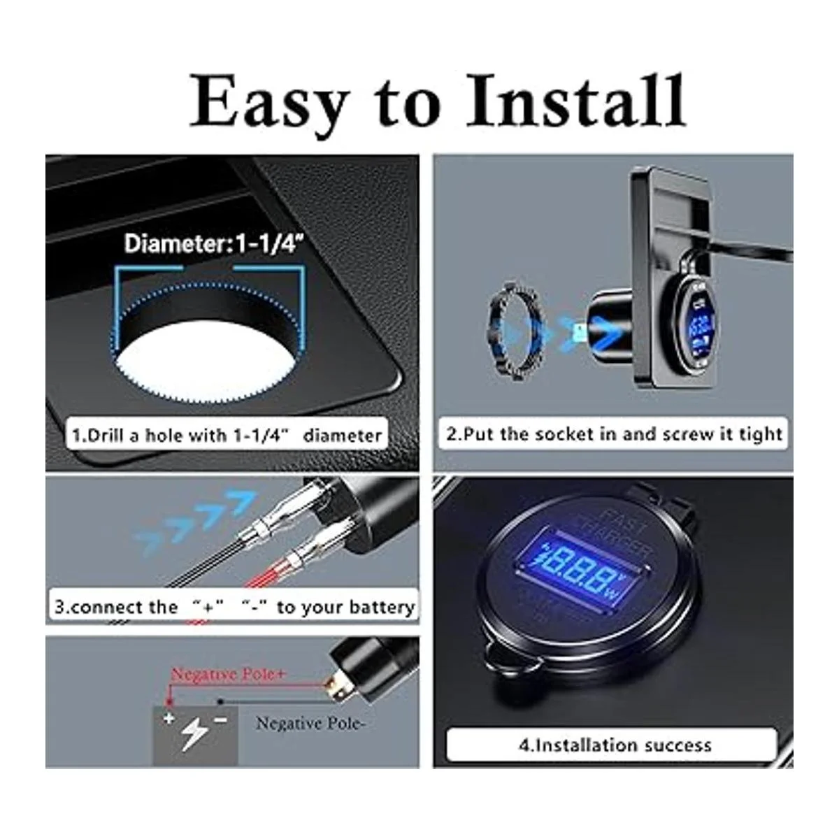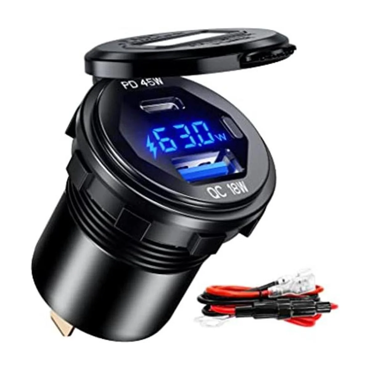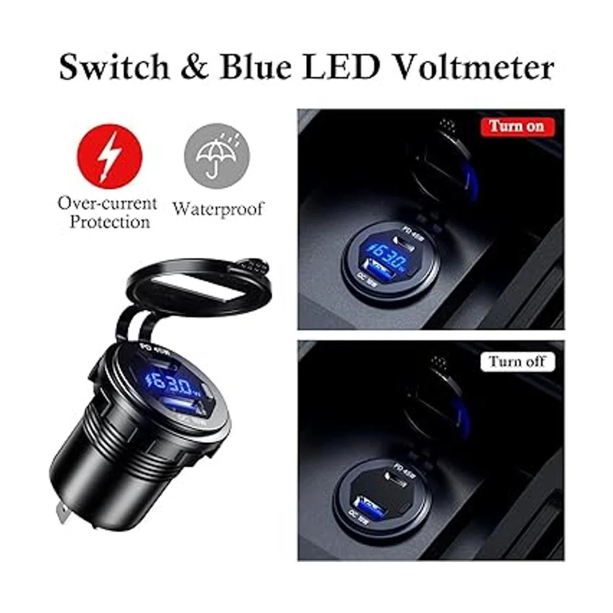 BATIGE PD Cargador rápido USB C de 45 W de 18 W, USB 3.0, impermeable, con interruptor, voltímetro LED y fusible de alambre, kit de bricolaje para automóvil de 12 V24 V, barco, autobús, camión, caravana, motocicleta