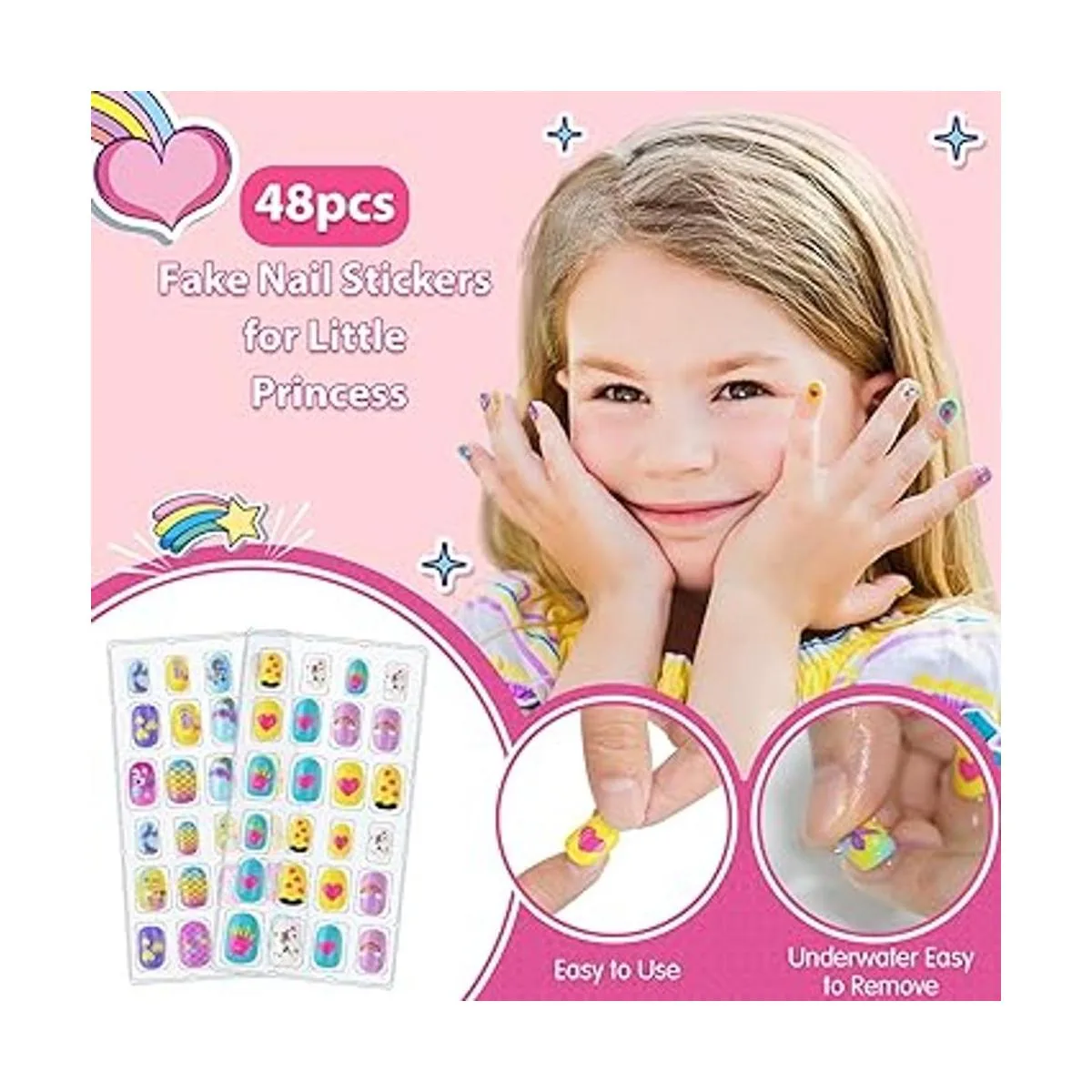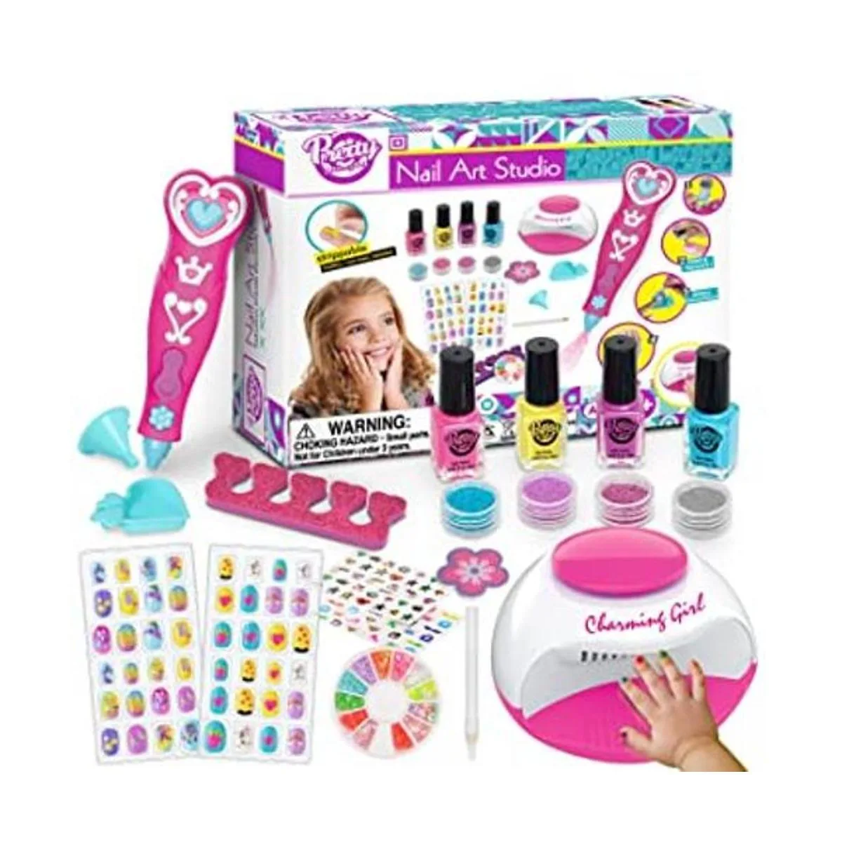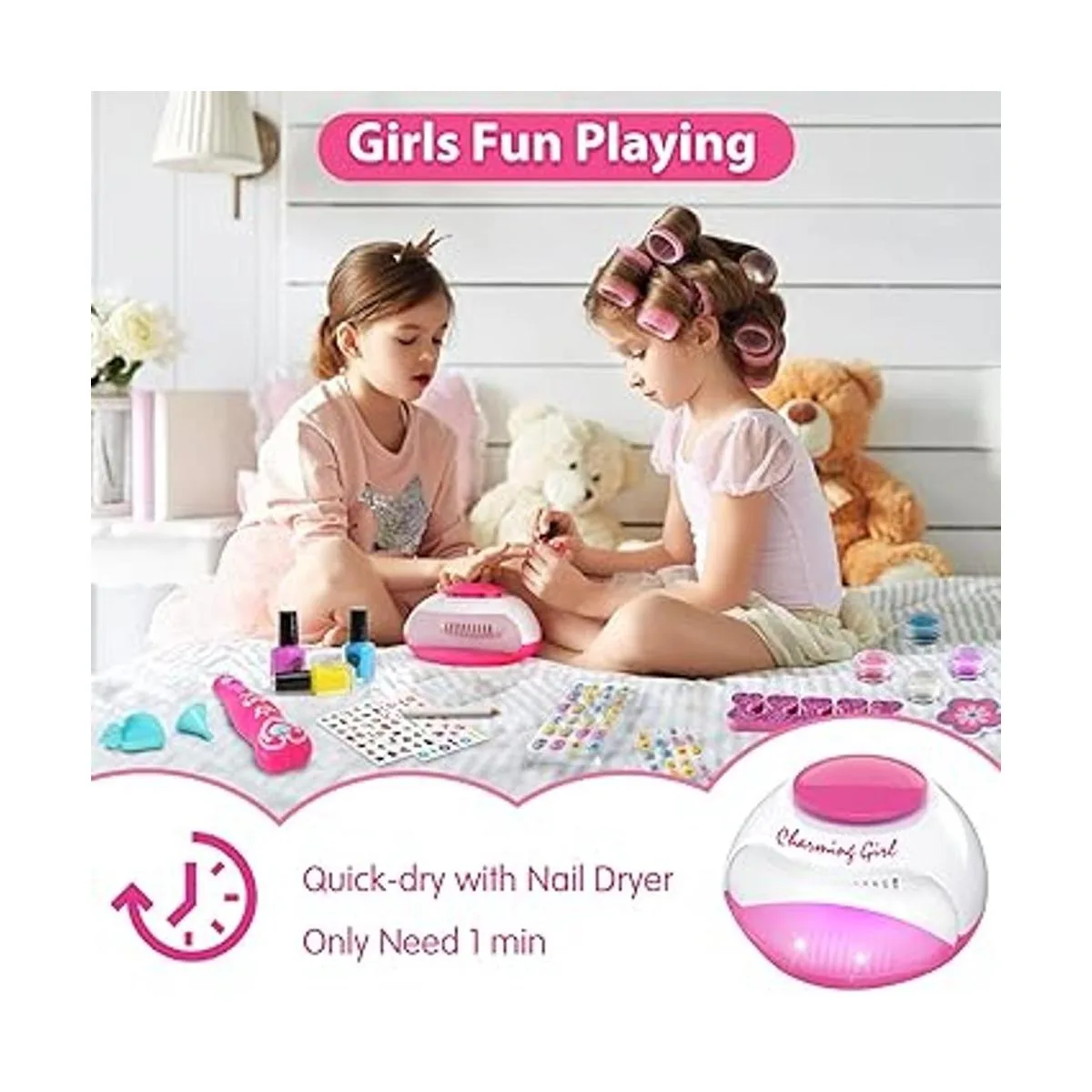 Esmalte de uñas y productos de decoración : el juego de esmaltes de uñas para niñas contiene secador de uñas, bolígrafo con purpurina, arte de uñas 3D, lima de uñas, bolígrafo electrostático, separador de dedos, 2 calcomanías de uñas de diseño, 2 uñas postizas, 5 esmaltes de uñas, 4 polvos de purpurina y una caja de polvo. Las niñas pueden utilizar su imaginación y creatividad para diseñar más de 200 tipos de arte de uñas de moda.