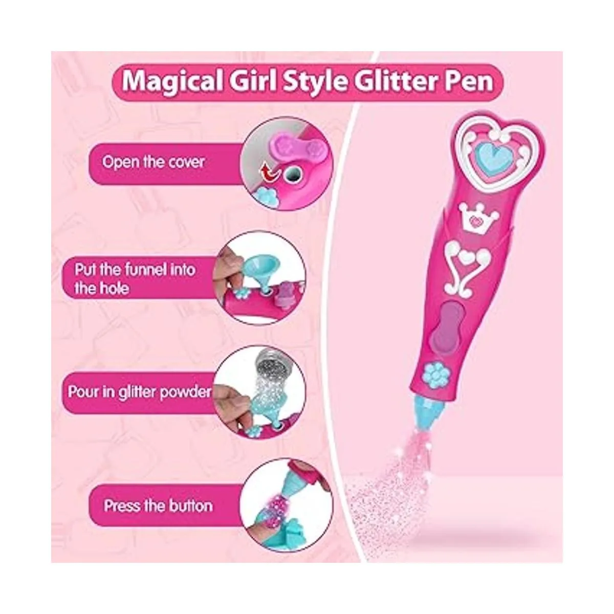Juego de manicura mejorado para niños : el bolígrafo mágico con purpurina es uno de los elementos favoritos de los niños. Llena el polvo a través del embudo, presiona el botón y rocía el polvo de color con un bolígrafo eléctrico de purpurina, luego coloca las manos en un secador de uñas para secar. Haz que los kits de arte de uñas sean más divertidos y fáciles. Funciona con 2 pilas AAA, no incluidas