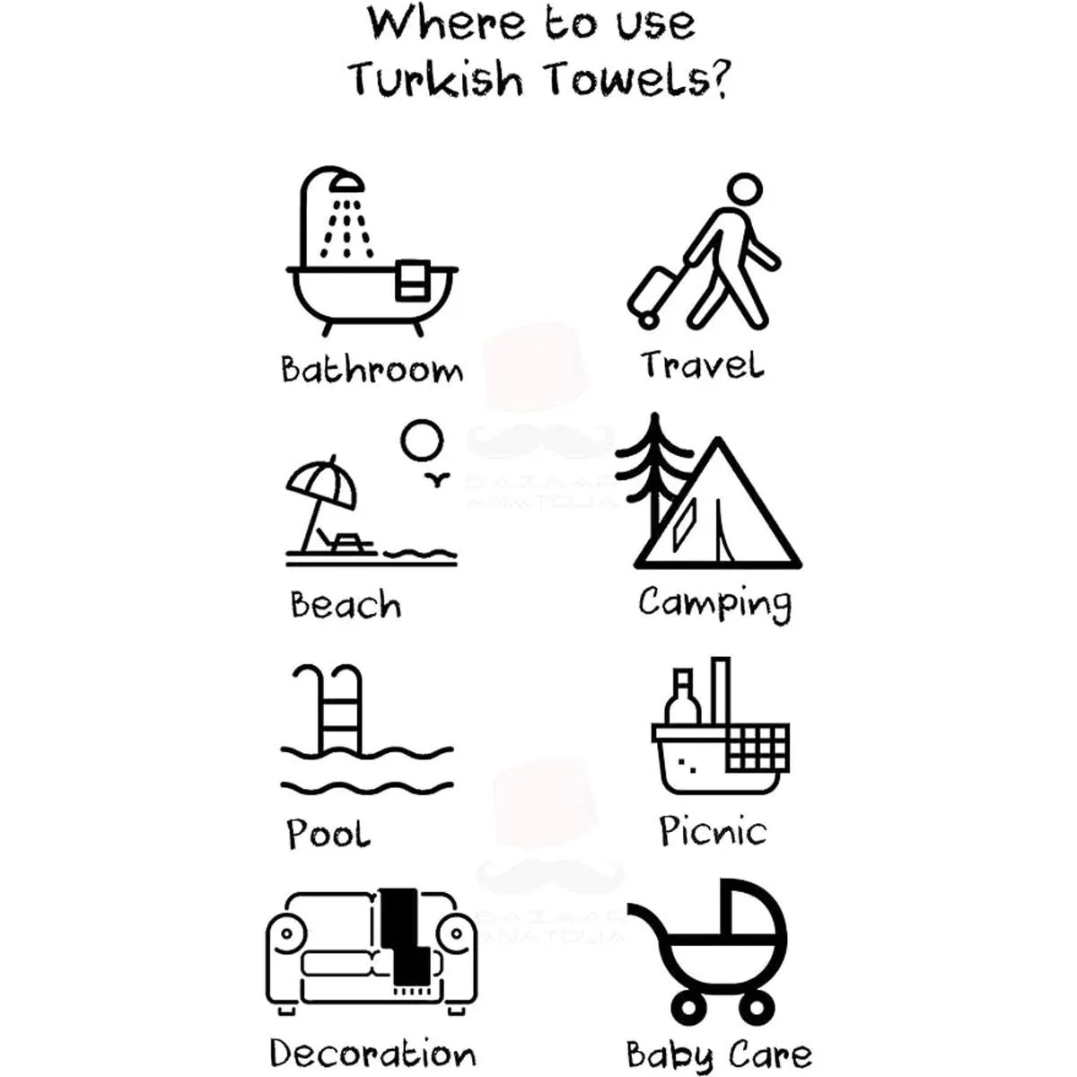 Versátil: hay muchas maneras de utilizar la toalla de playa turca. Puedes utilizar la toalla turca como una bufanda en el exterior, chal en la terminal, manta de viaje en un avión, toalla de playa de gran tamaño cuando salgas del avión y vayas a la playa. Muy útil como toalla de playa de viaje. O se puede utilizar como toallas de baño, toalla de esterilla de yoga, toalla de piscina o una manta en tu casa.