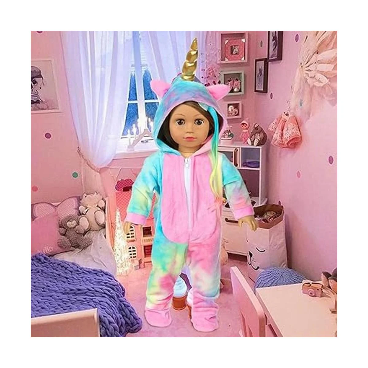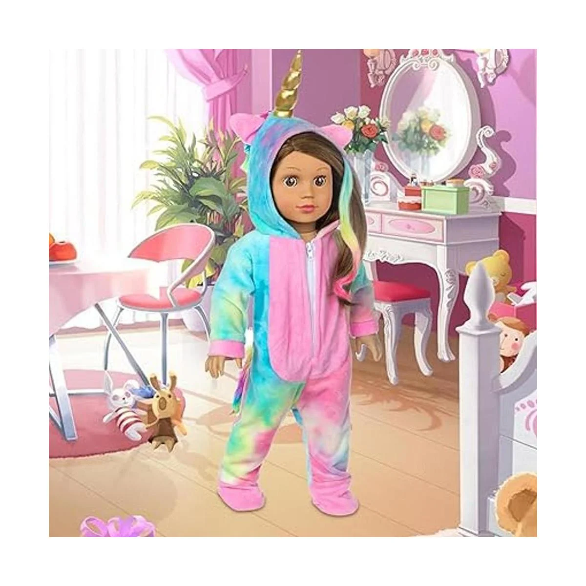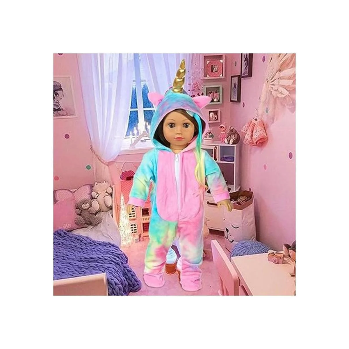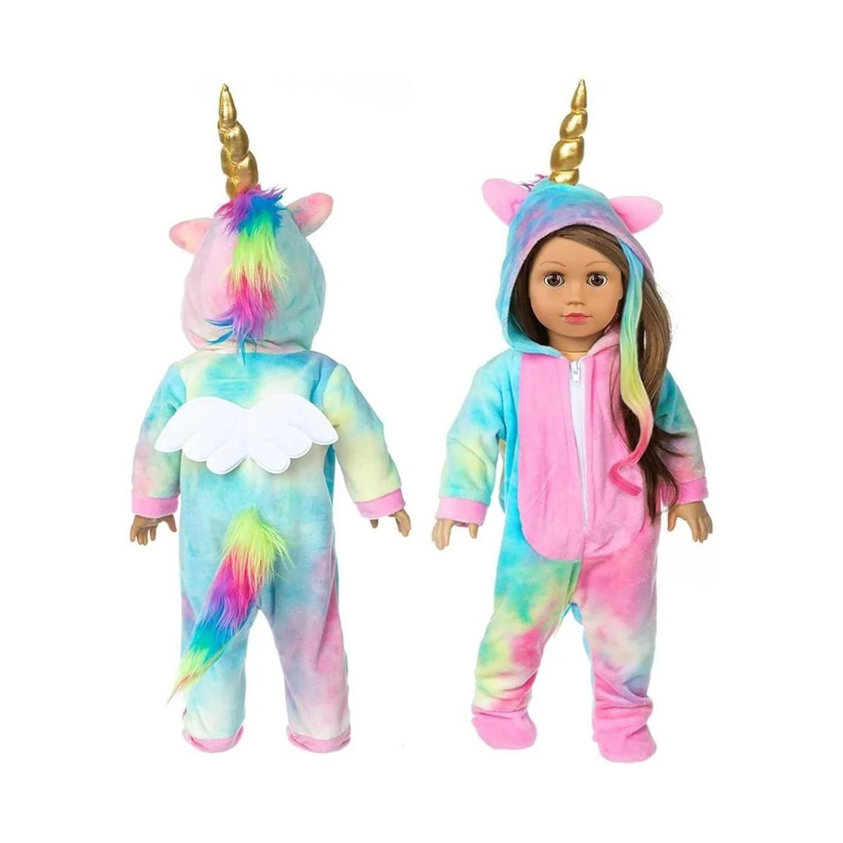 BDDOLL Ropa de muñeca de 18 pulgadas, disfraz de muñeca de unicornio arcoíris, pijama con lazos para el cabello, alas de ángel, se adapta a accesorios de muñeca estadounidenses de 18 pulgadas para niña