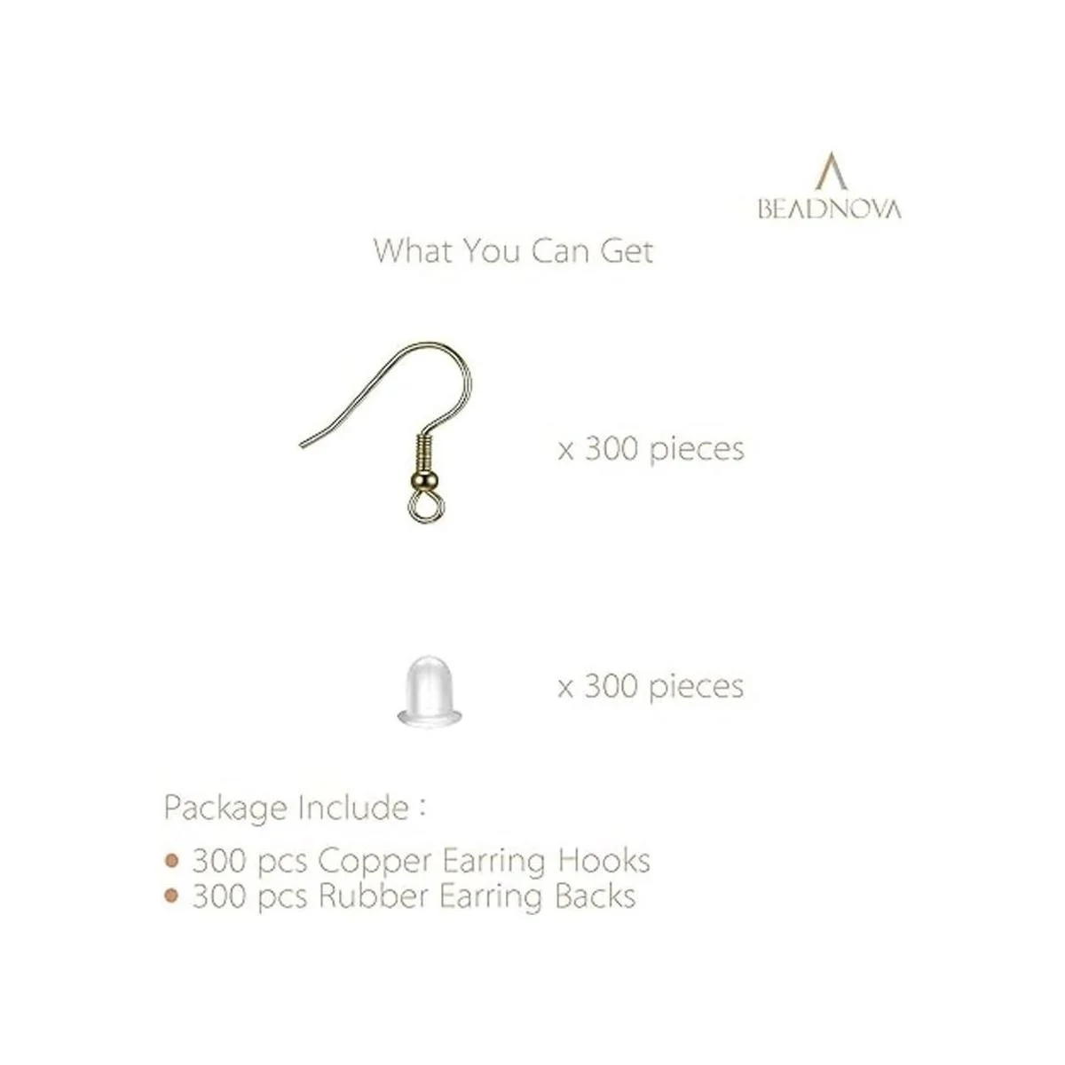 BEADNOVA 300 ganchos para pendientes con pendientes de goma, gancho para pendientes para hacer joyas, suministros de pendientes 300 ganchos de cobre y 300 pendientes en total, 600 unidades