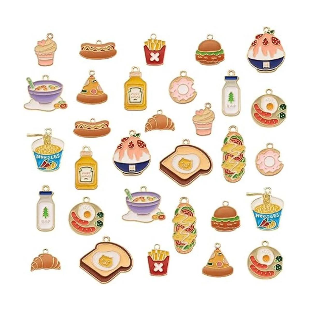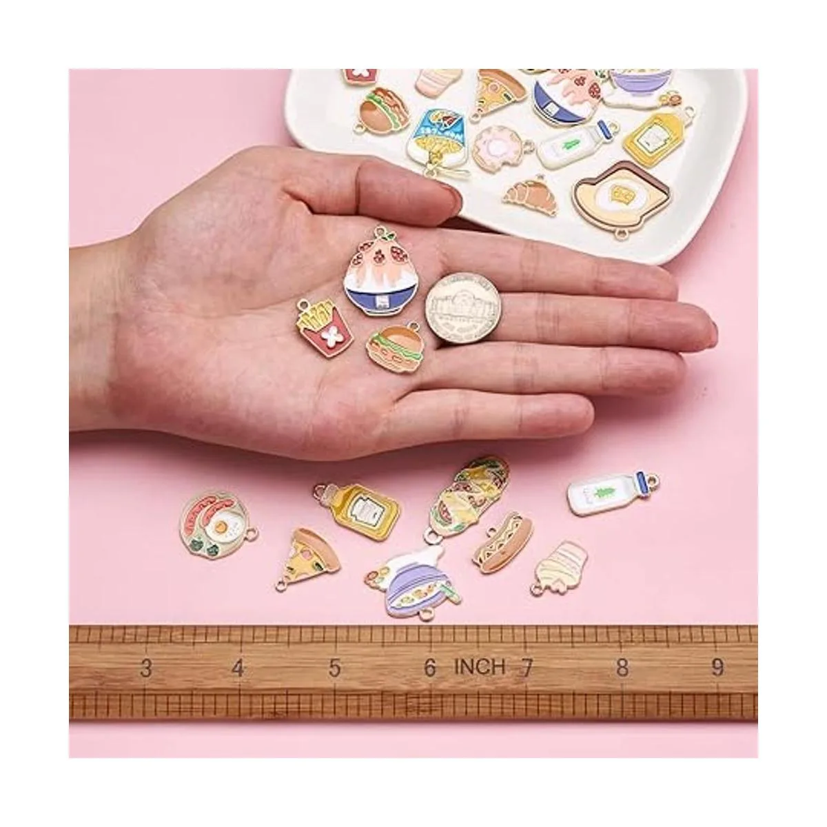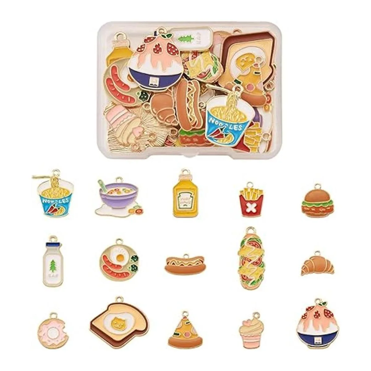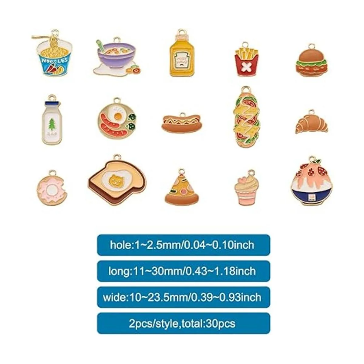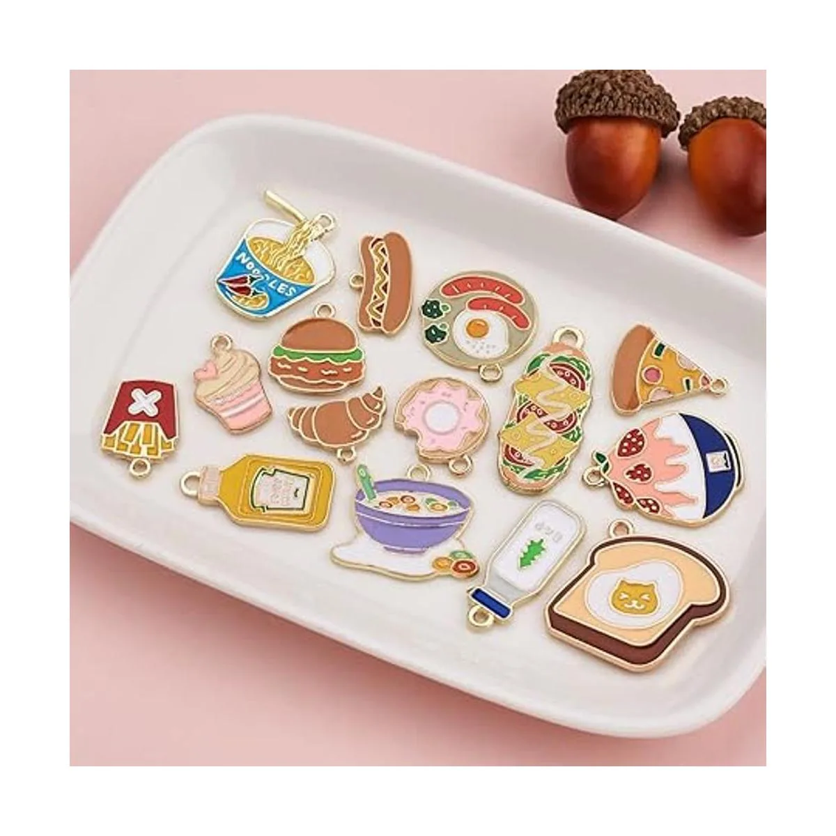 Beadthoven 30 colgantes esmaltados con temática de alimentos de 15 estilos mezclados chapados en oro claro, dona, pan de leche, helado, comida dulce, metal esmaltado para bricolaje, collares, pulseras, aretes, accesorios para hacer joyas
