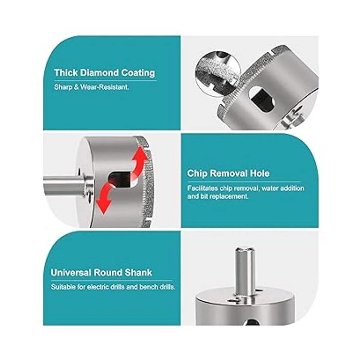Amplia aplicación: 15 tamaños satisfacen la mayoría de las necesidades de perforación de agujeros para tu trabajo o vida diaria. Aplicable para la mayoría de materiales frágiles y duros como vidrio, azulejos de porcelana, cerámica, mármol, granito, etc. No apto para vidrio templado ni hormigón.