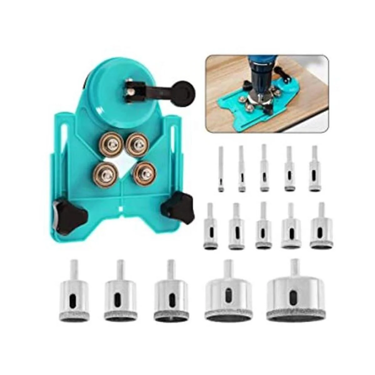 Juego completo de taladros de agujero: incluye 15 tamaños de brocas de diamante: 6/8/10/12/14/16/18/20/22/25/26/28/30/40/1.969 in y una plantilla de perforación universal herramienta de posicionamiento. Nota: la máquina de taladro no está incluida.
