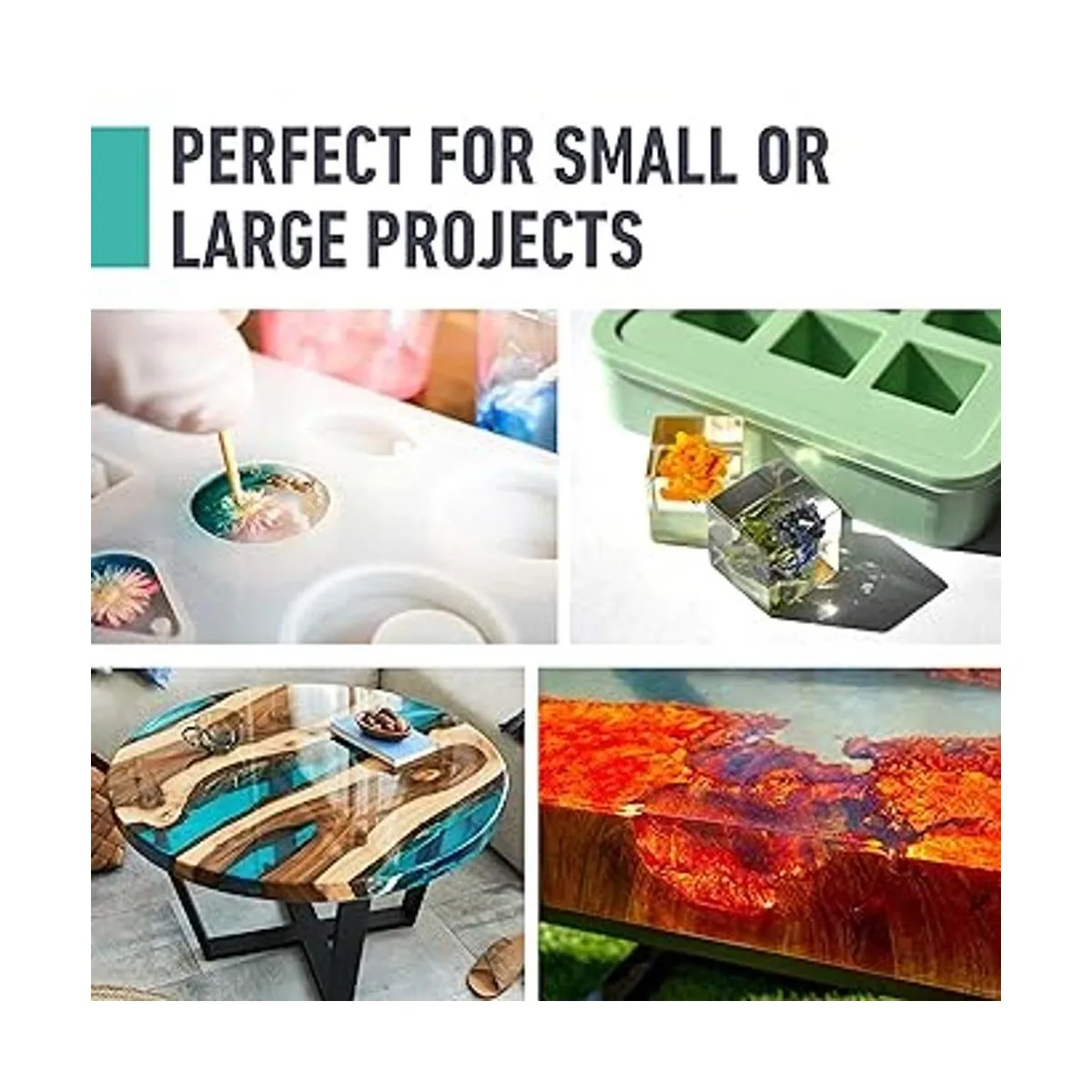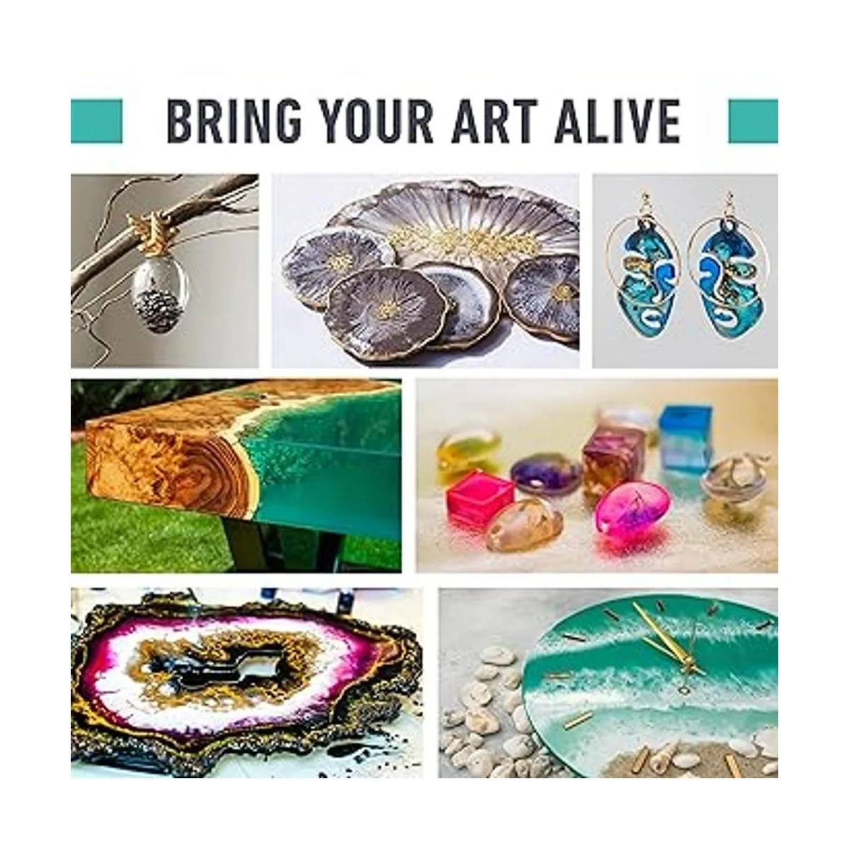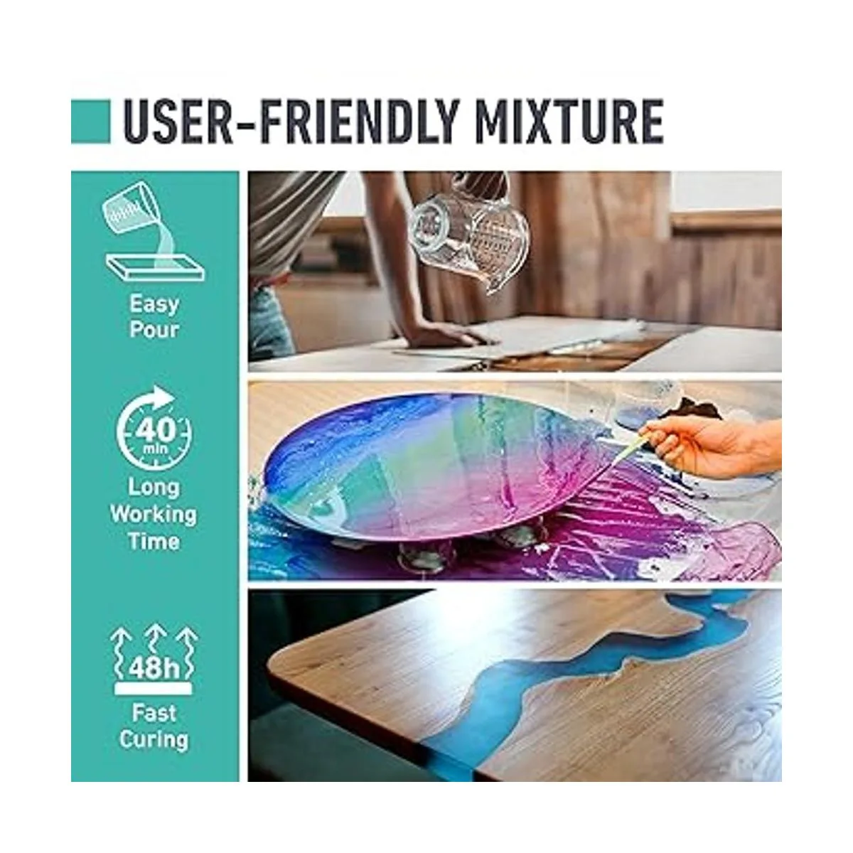 Fácil de usar: mezclar una simple relación 1:1 de la resina y el endurecedor es todo lo que se requiere para empezar. Con 40 minutos de tiempo de trabajo, es perfecto para principiantes, y permite tiempo para mezclar en colores vivos para creaciones llamativas. La fórmula de resina epoxi fácil de verter se nivela y suaviza, se seca rápidamente en 2448 horas y sin burbujas a diferencia de muchas otras resinas en el mercado.