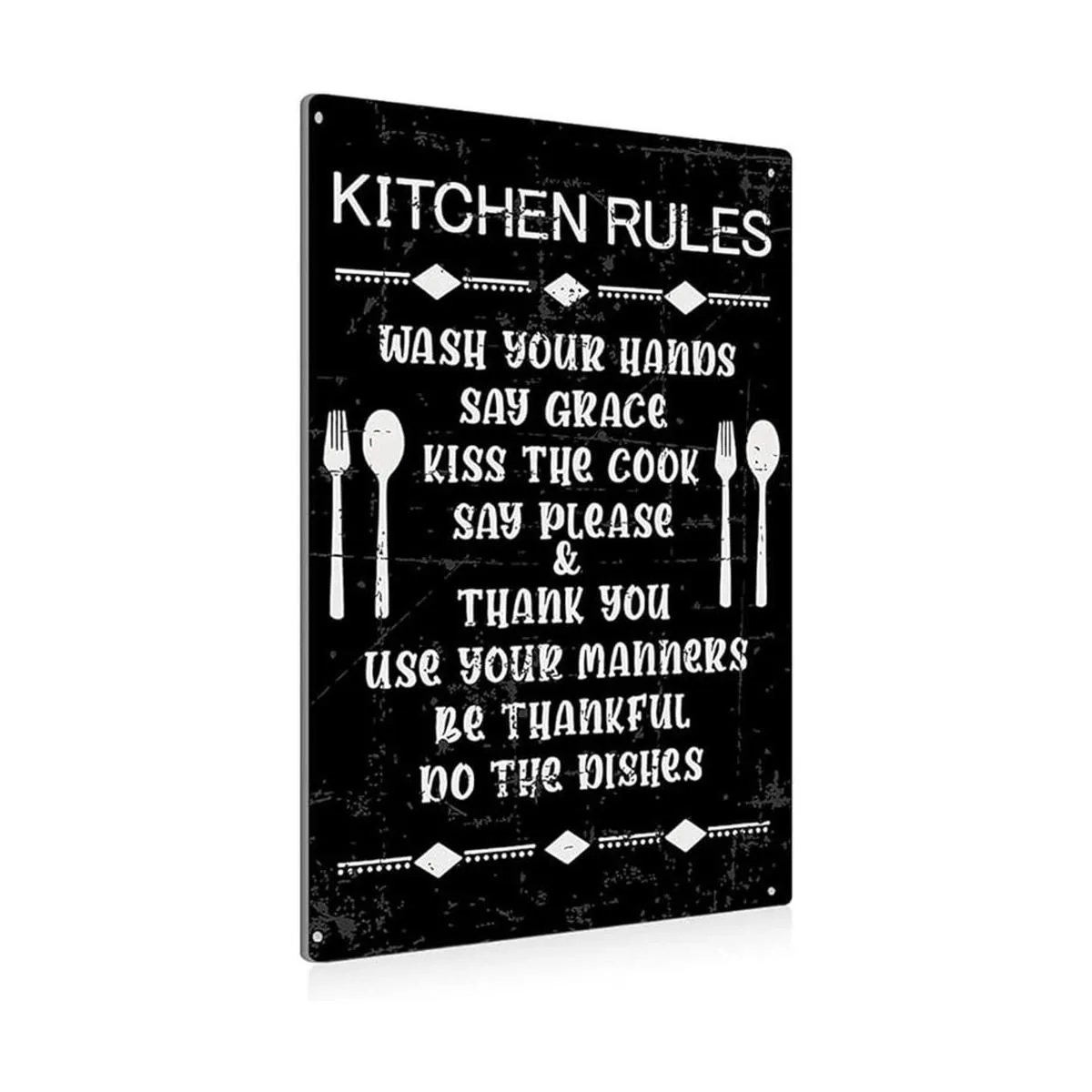 BEASTZHENG Funny Kitchen Reglas Metal Tin Sign Wall Art Decor Vintage Sign para el hogar Café Bar Decoración Regalos Negro