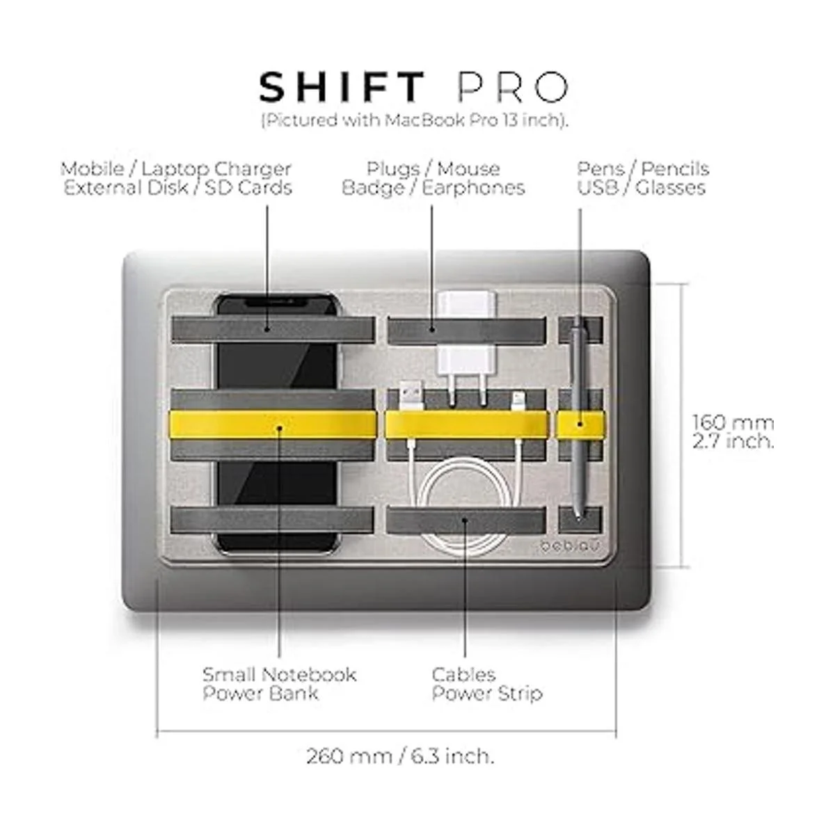 Organizador portátil diario: se pega en cualquier laptop de 12 pulgadas o más grande y es más delgado que un bolígrafo. Lleva tus artículos esenciales contigo, organizados y a mano. Mantén tus manos y bolsillos libres. SHIFT PRO es la forma más fácil y práctica de llevar tus artículos esenciales contigo cuando cambies de lugar, en cualquier lugar. Mantén tus cosas en su lugar y nunca pierdas nada: teléfono, discos duros, mouse inalámbrico, cables USB, auriculares, bolígrafos, lápices, tarjetas de visita, etc.